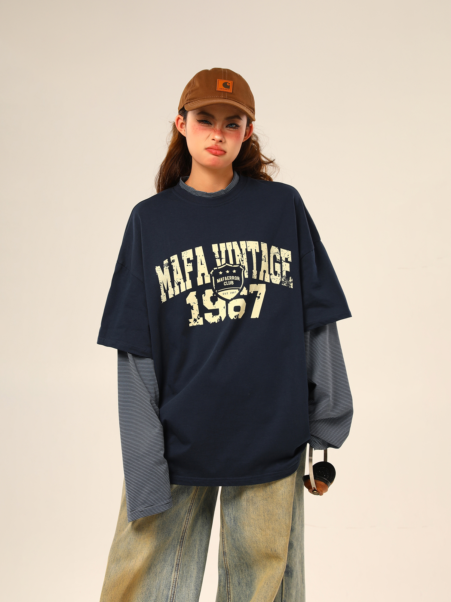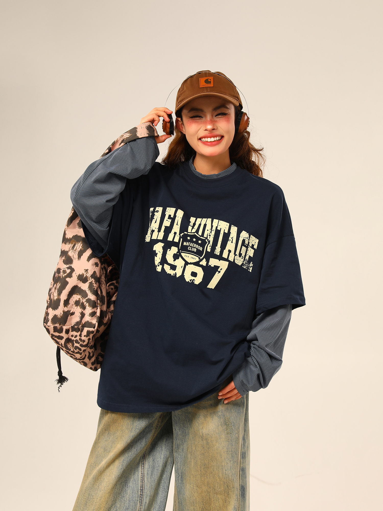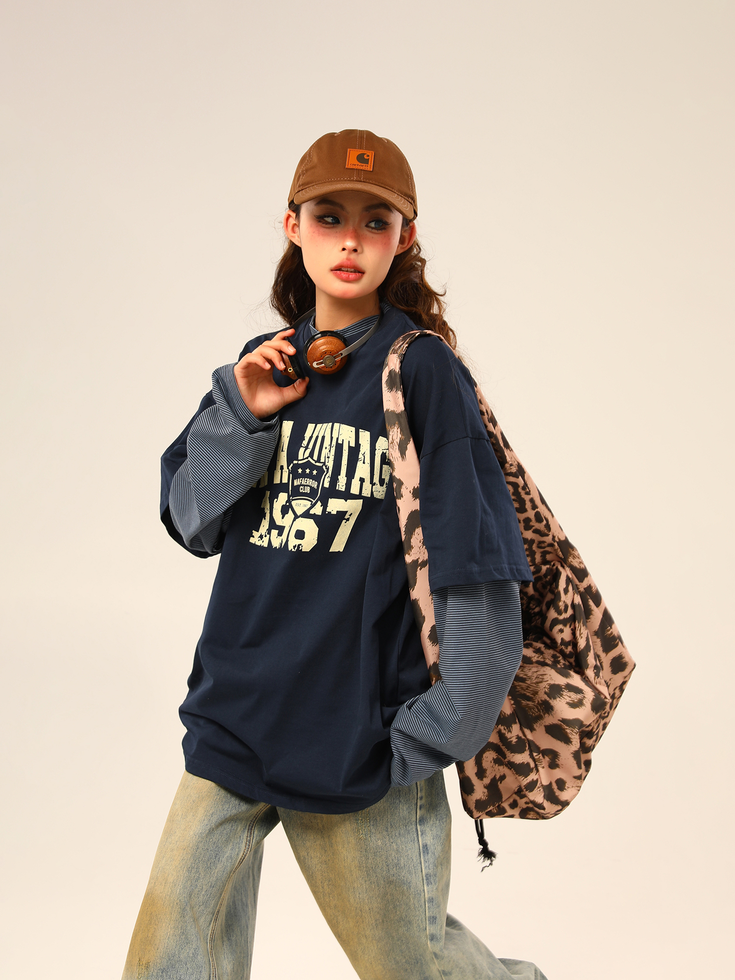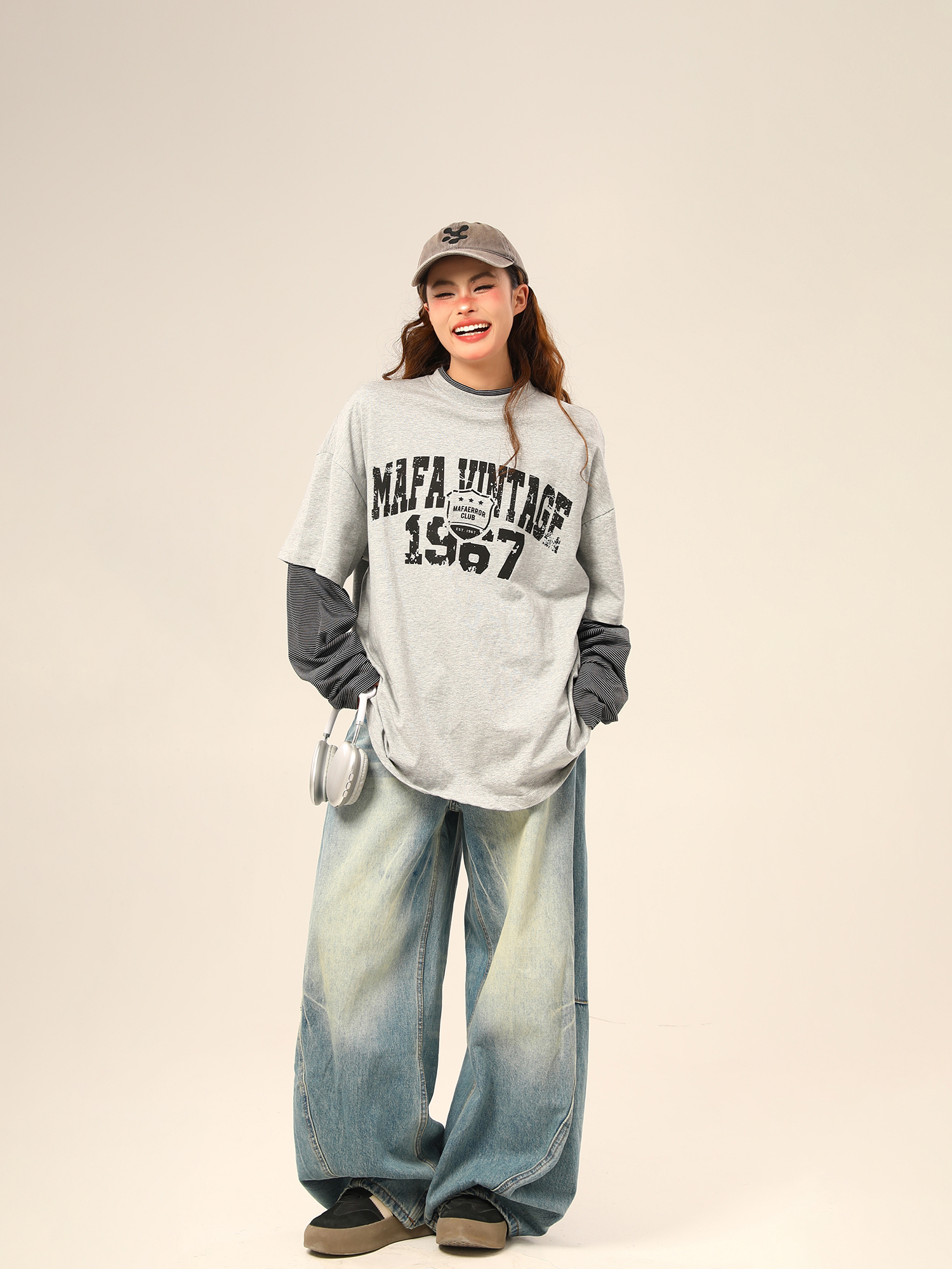 美式復古假兩件長袖衛衣女字母印花百搭上衣