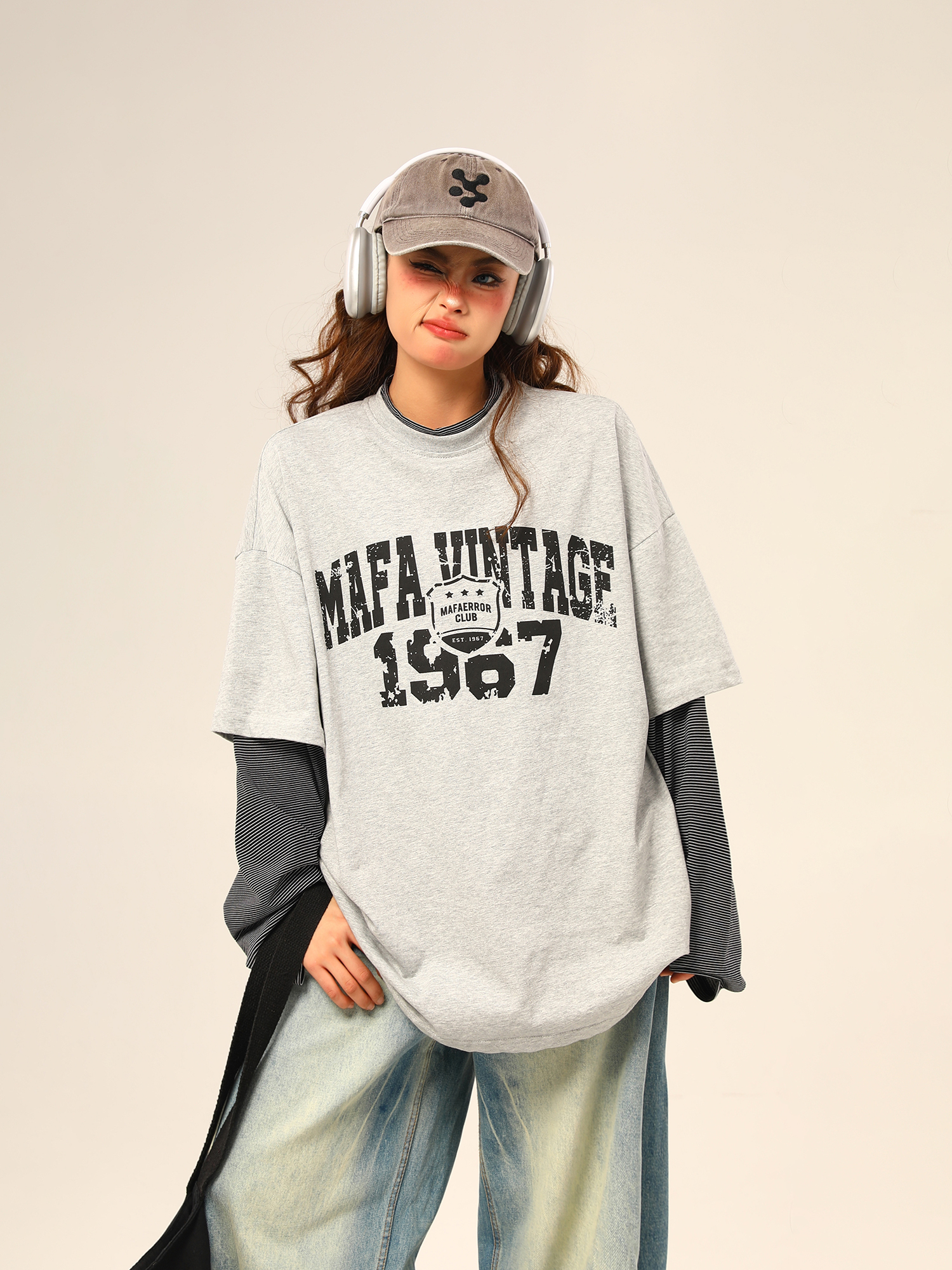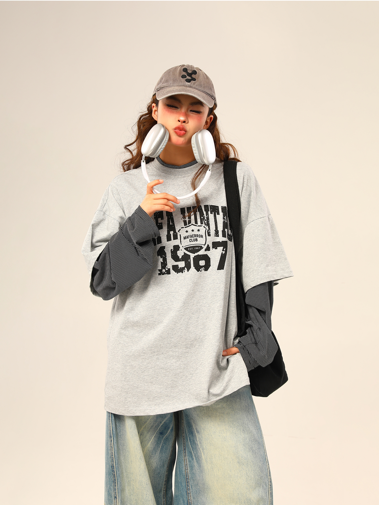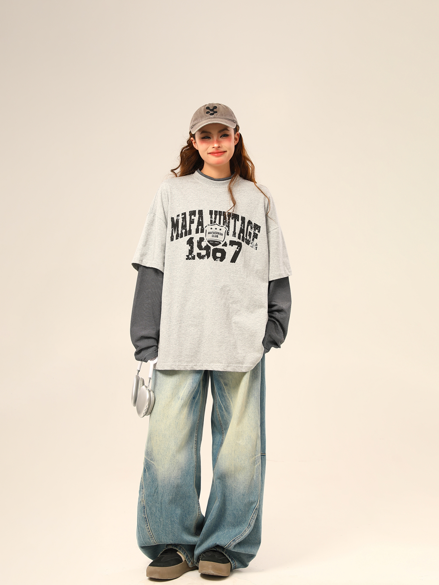 美式復古假兩件長袖衛衣女字母印花百搭上衣