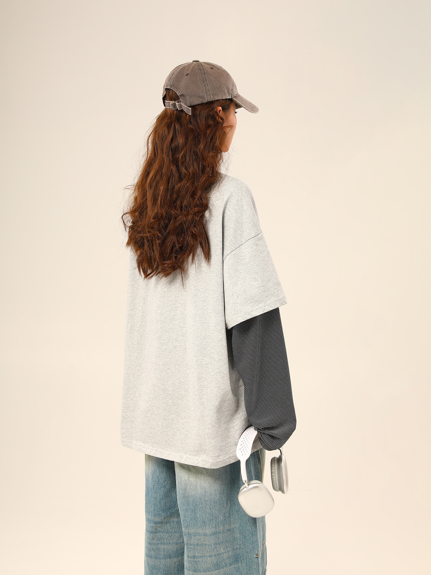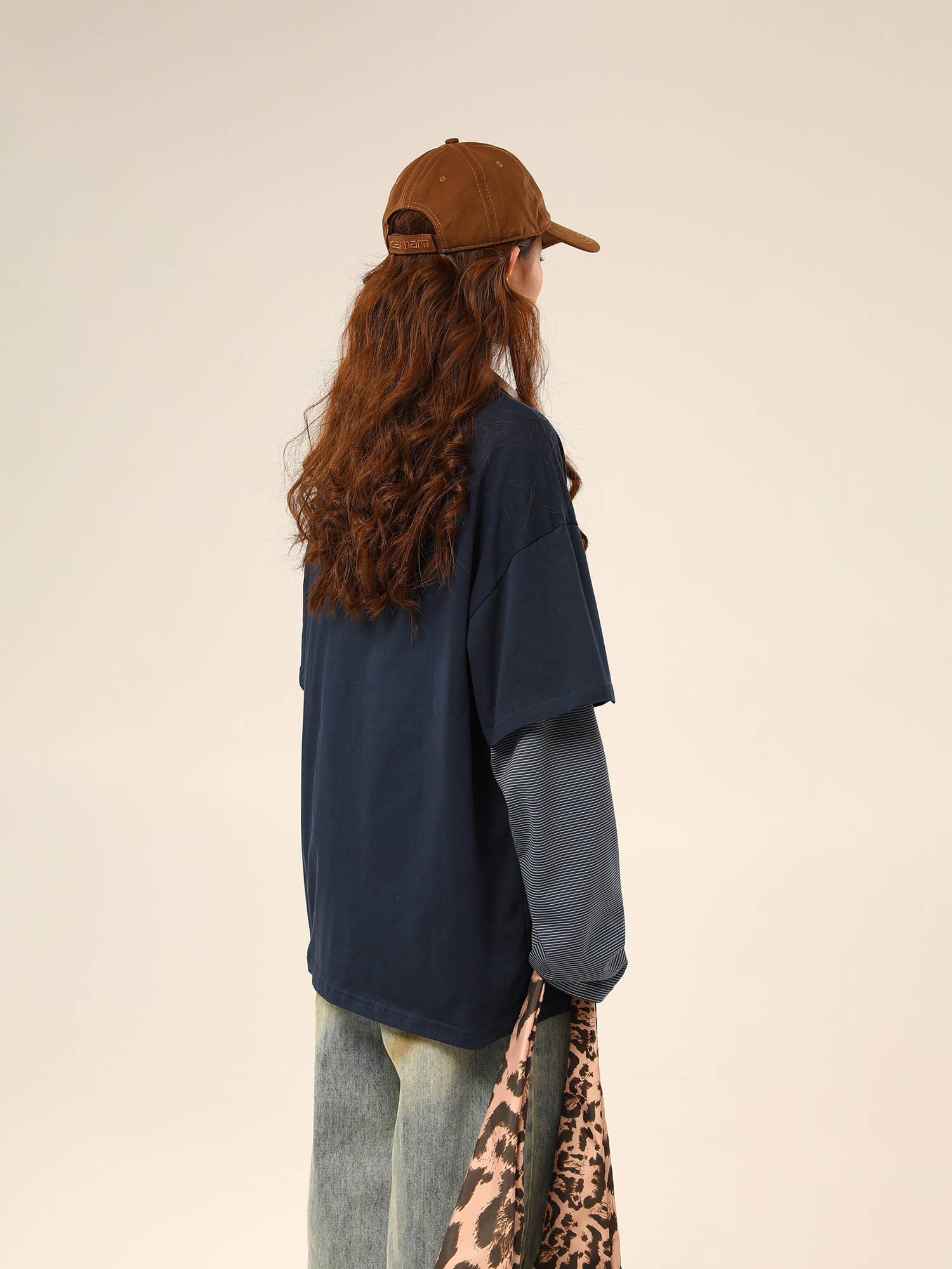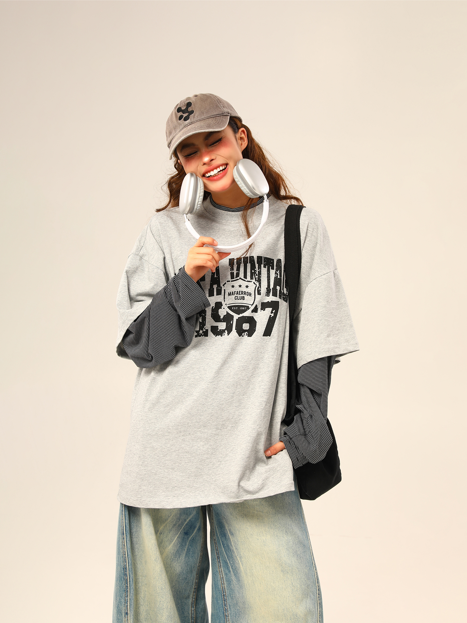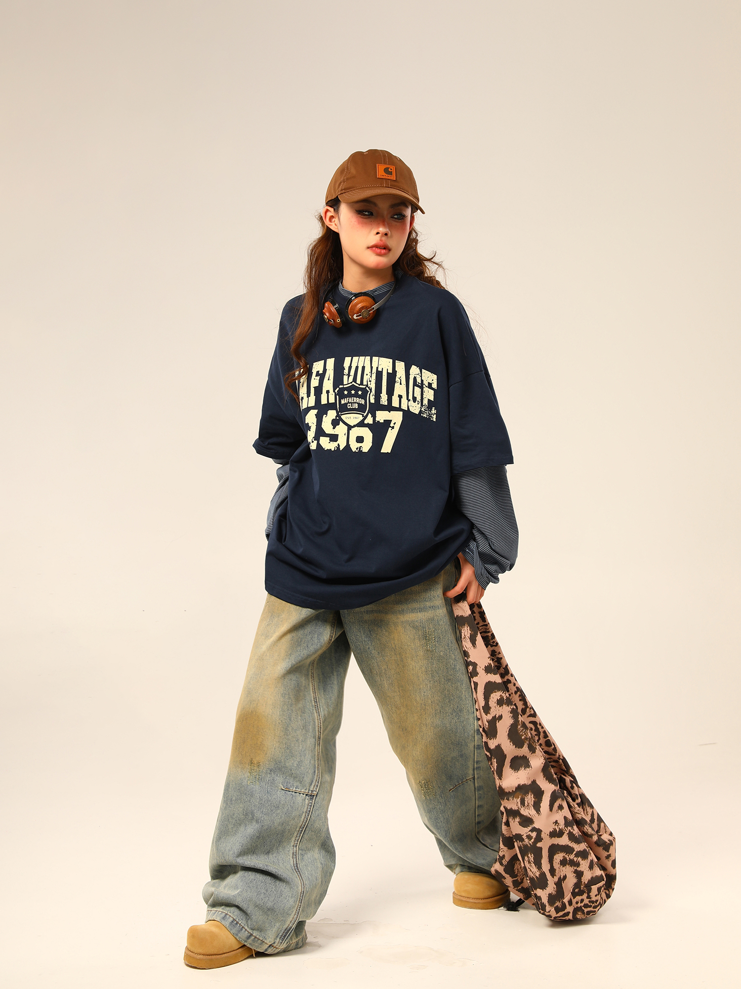 美式復古假兩件長袖衛衣女字母印花百搭上衣