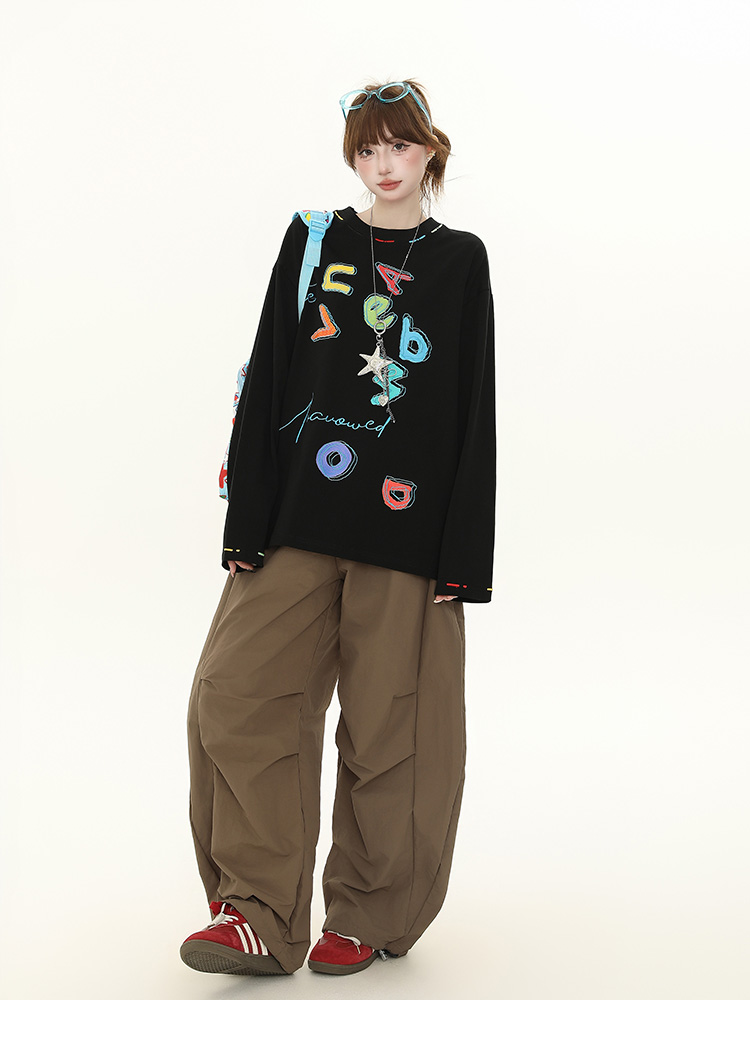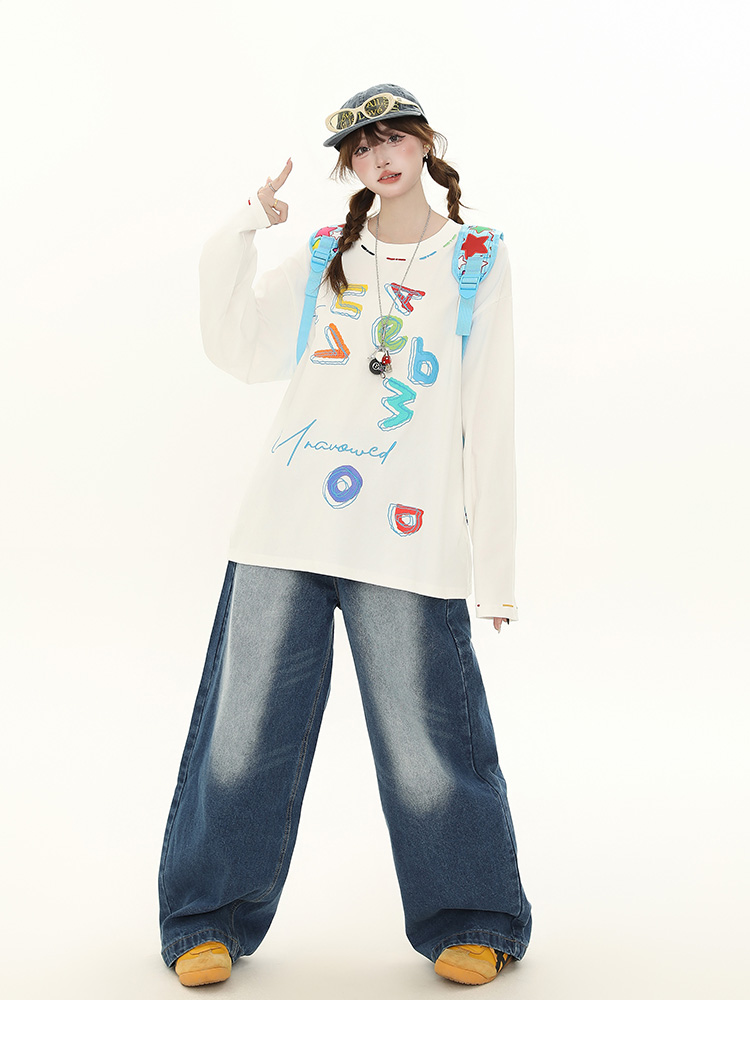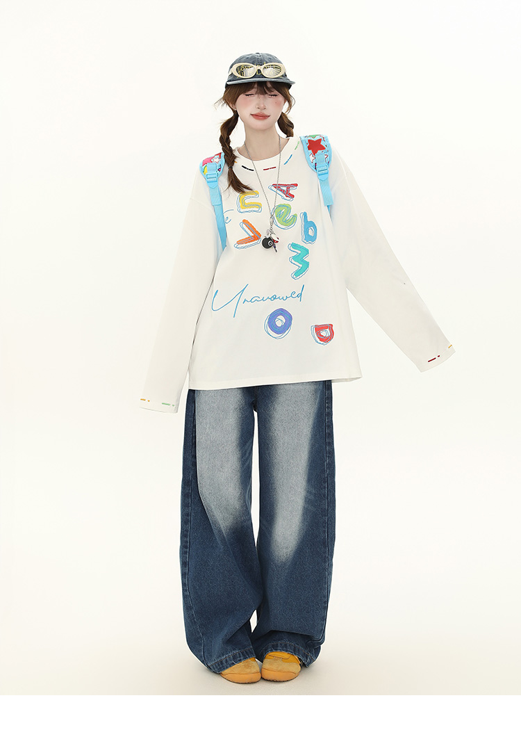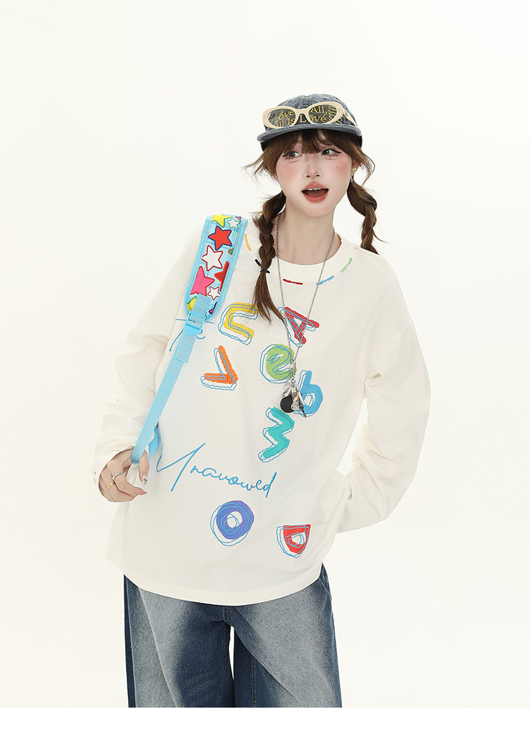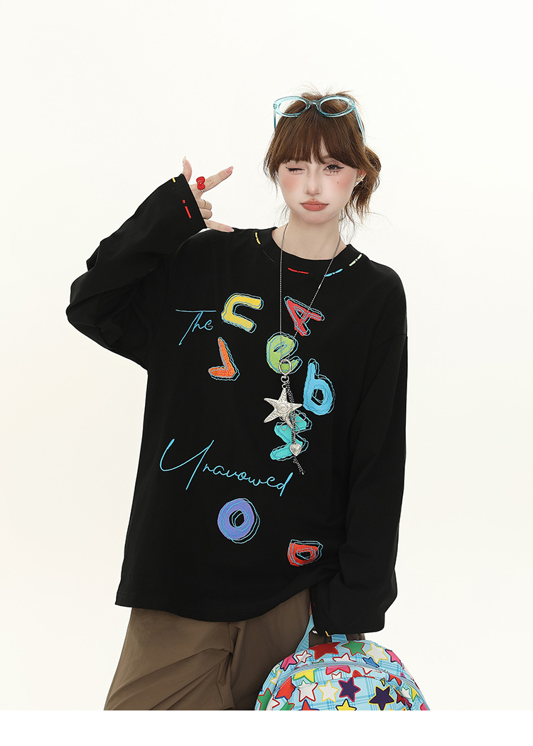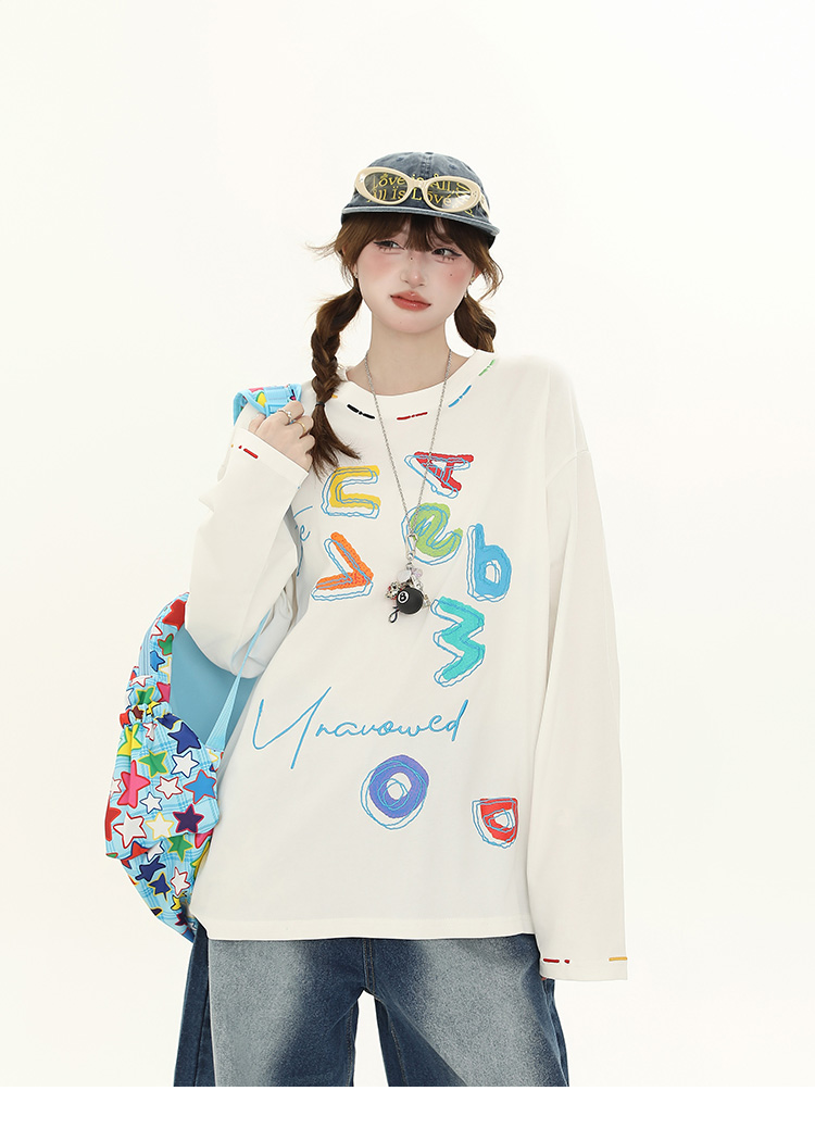 美式復古卡通印花長袖T恤女秋季新款寬鬆顯瘦百搭上衣