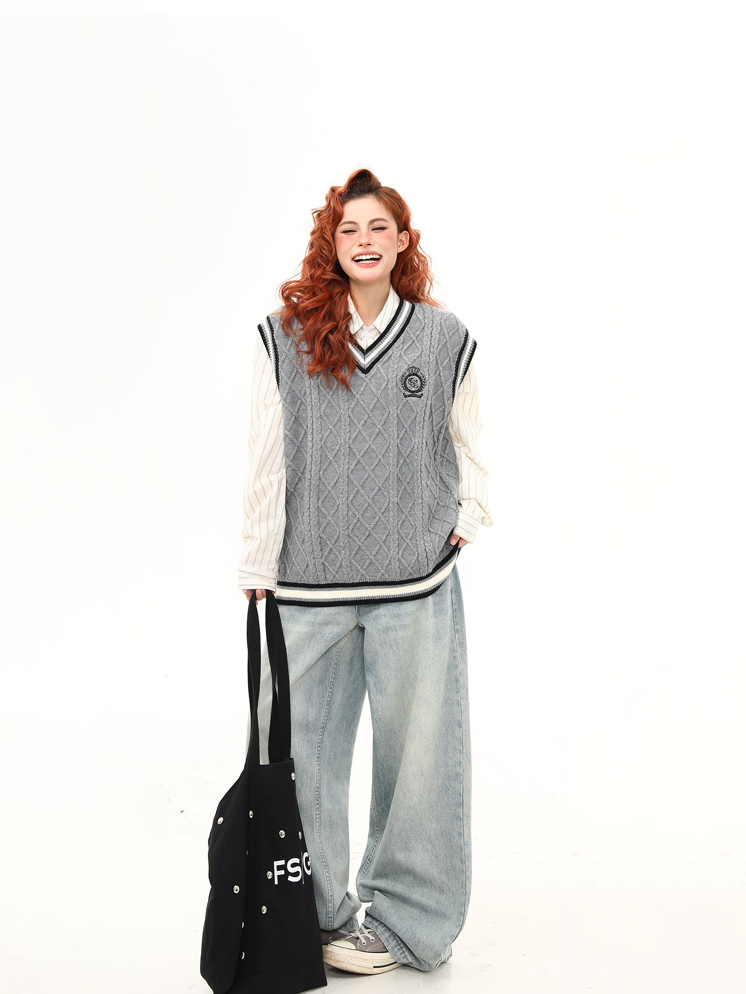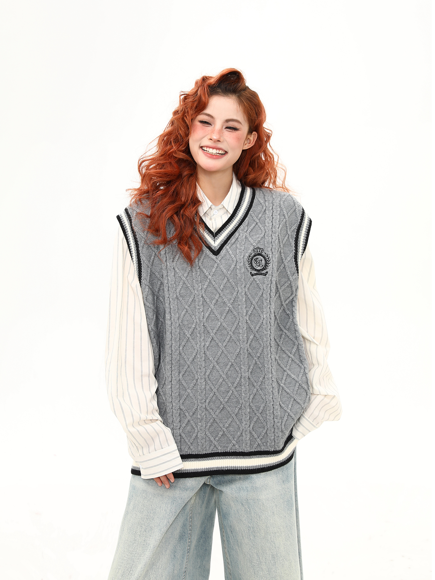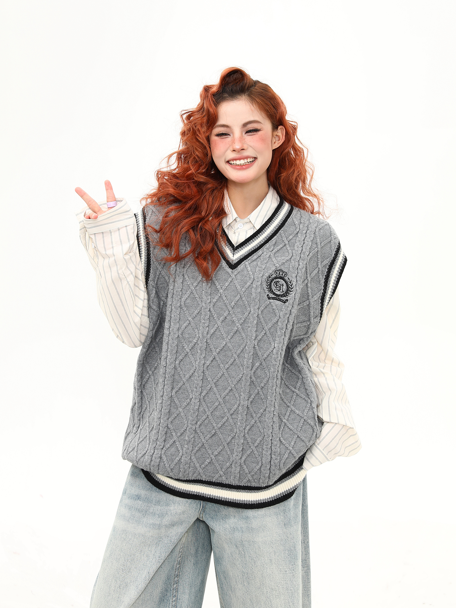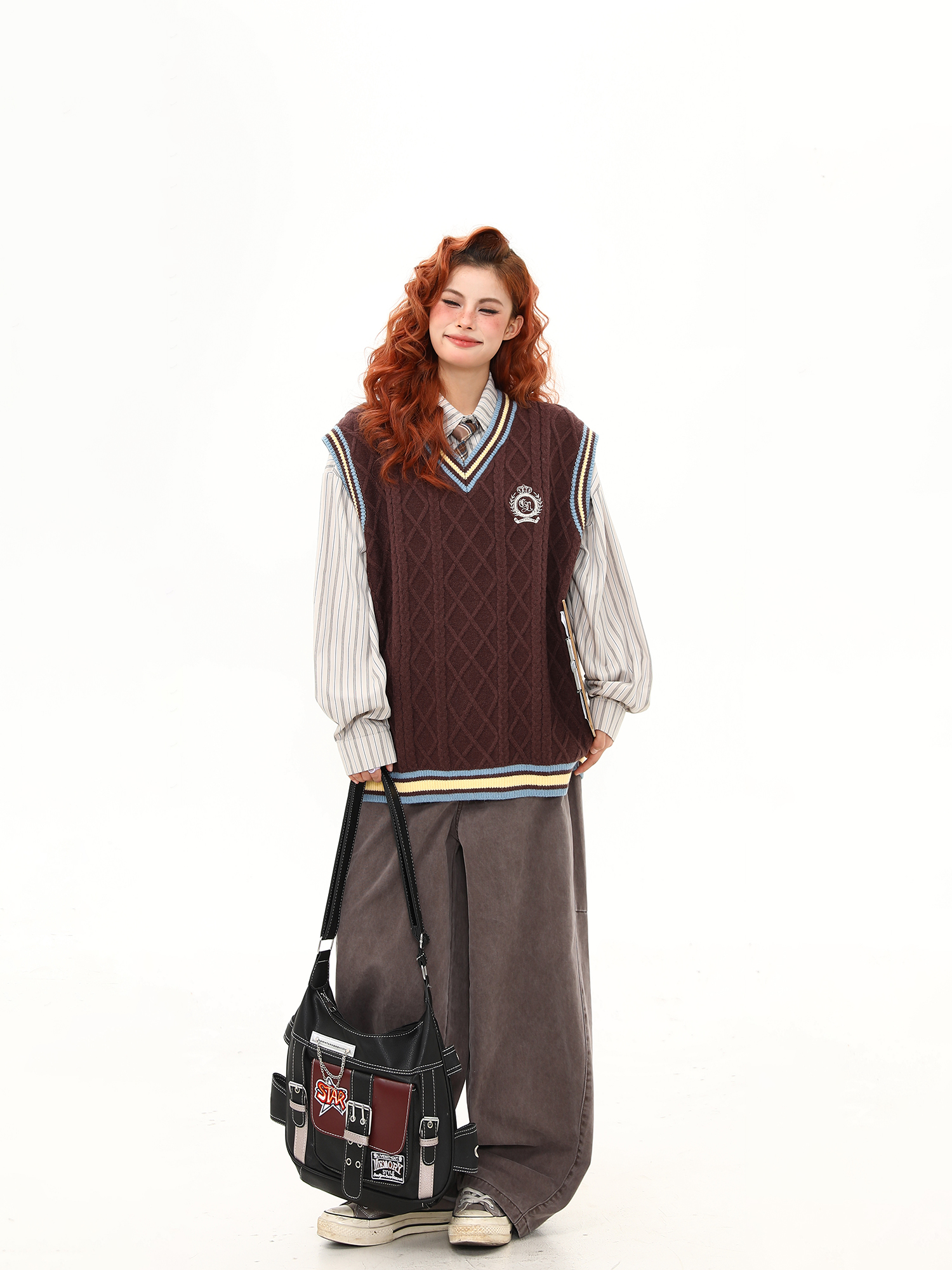 美式復古學院風刺繡美拉德馬甲背心毛衣女秋冬寬鬆針織衫