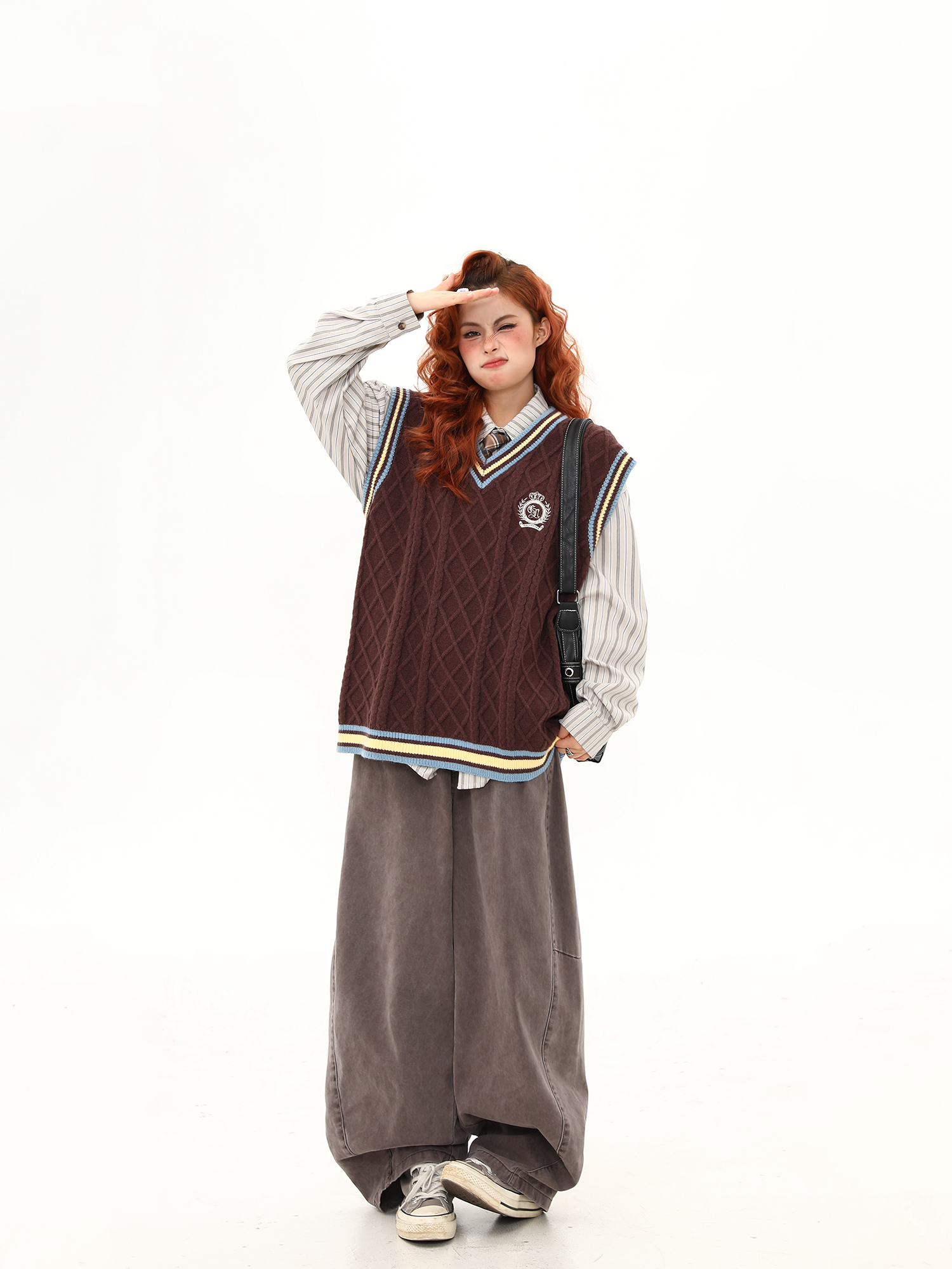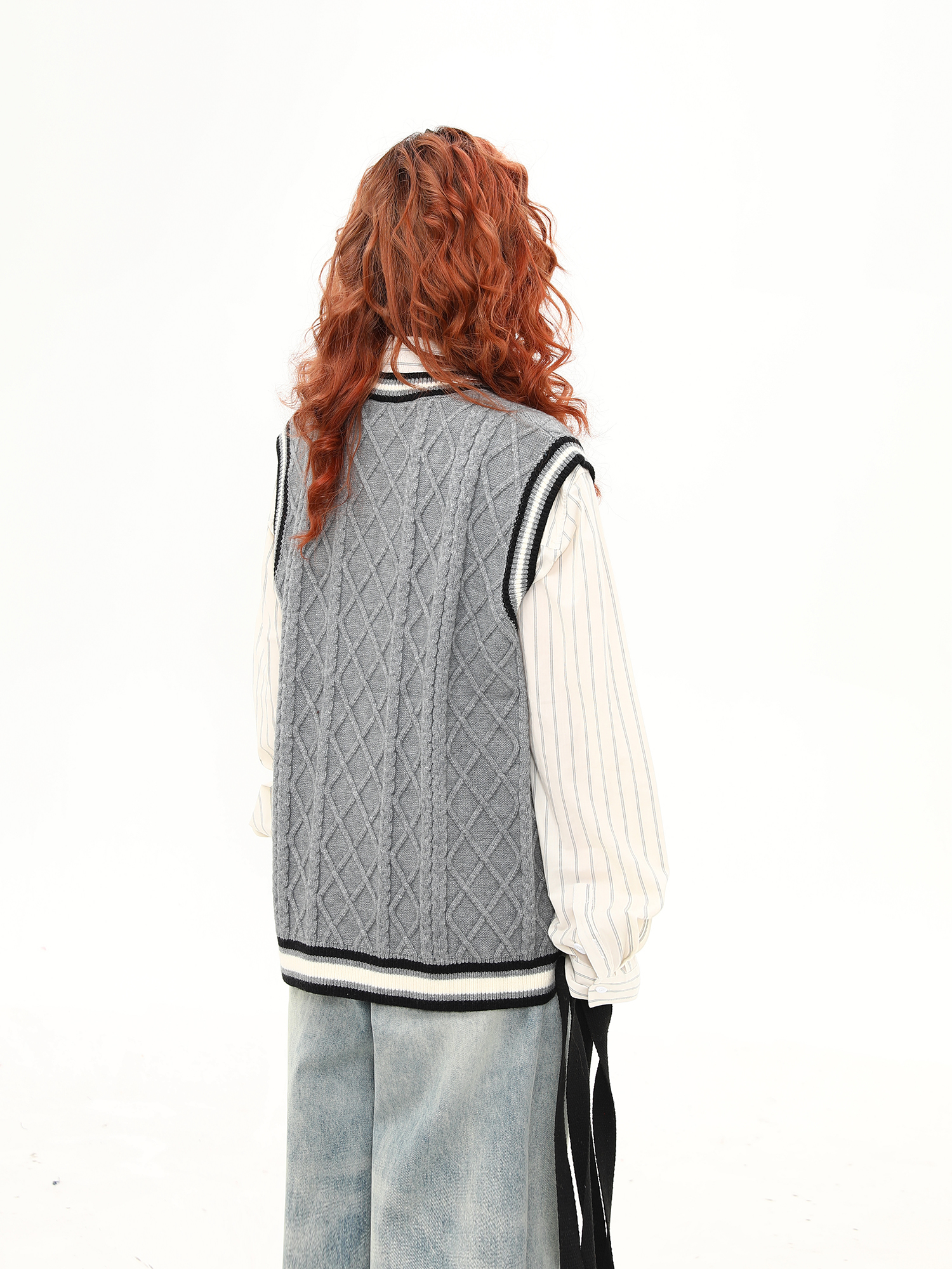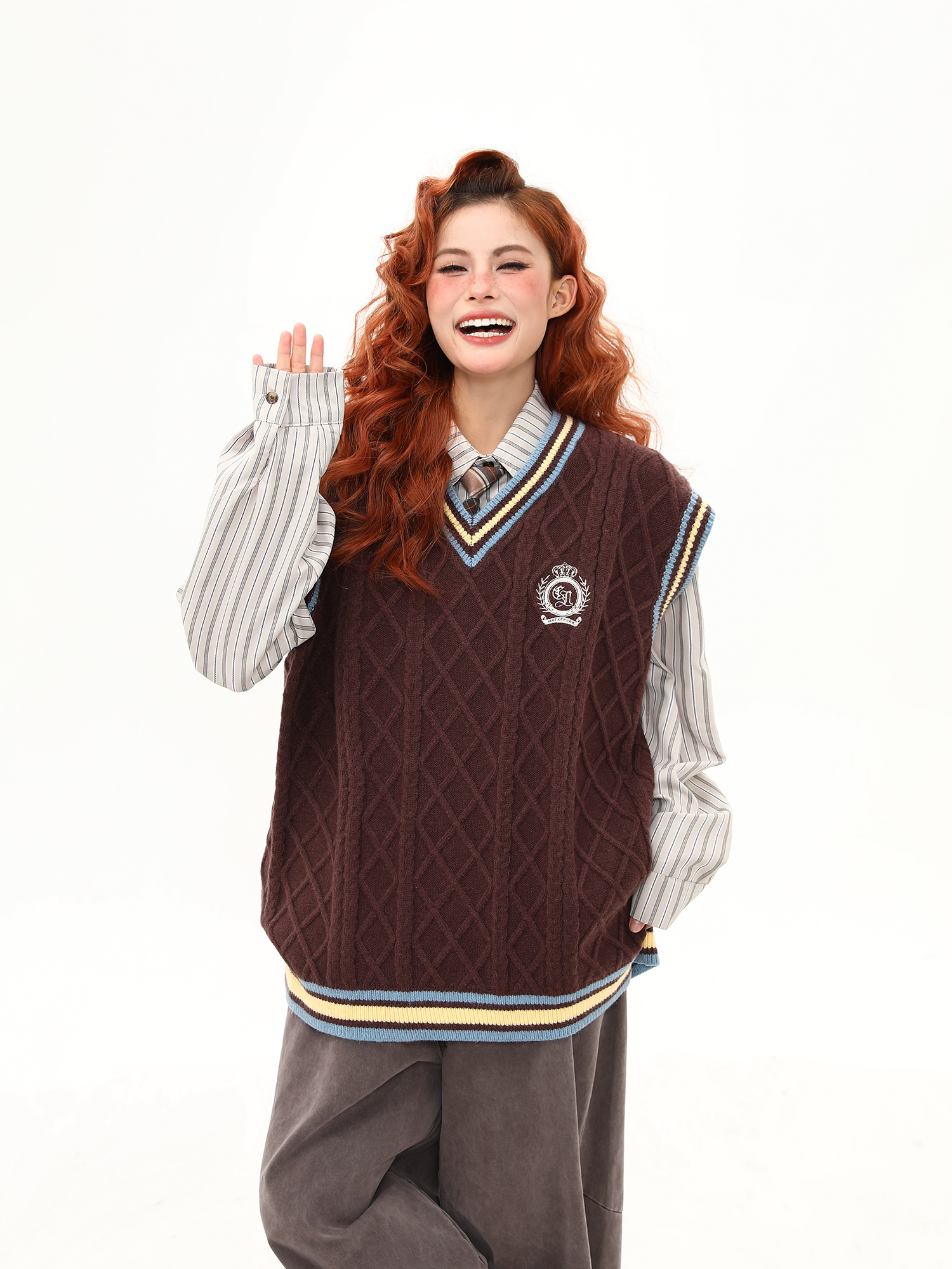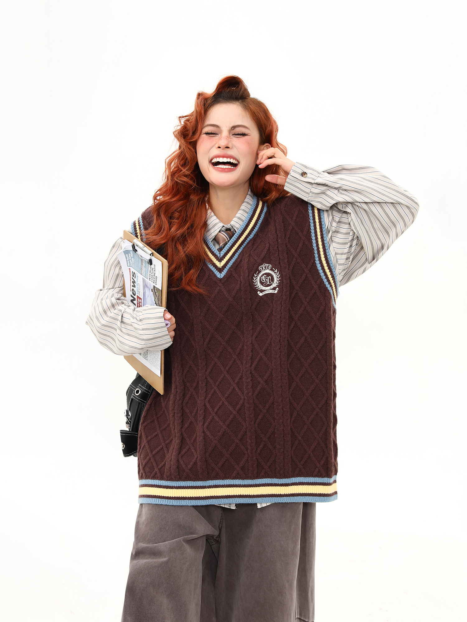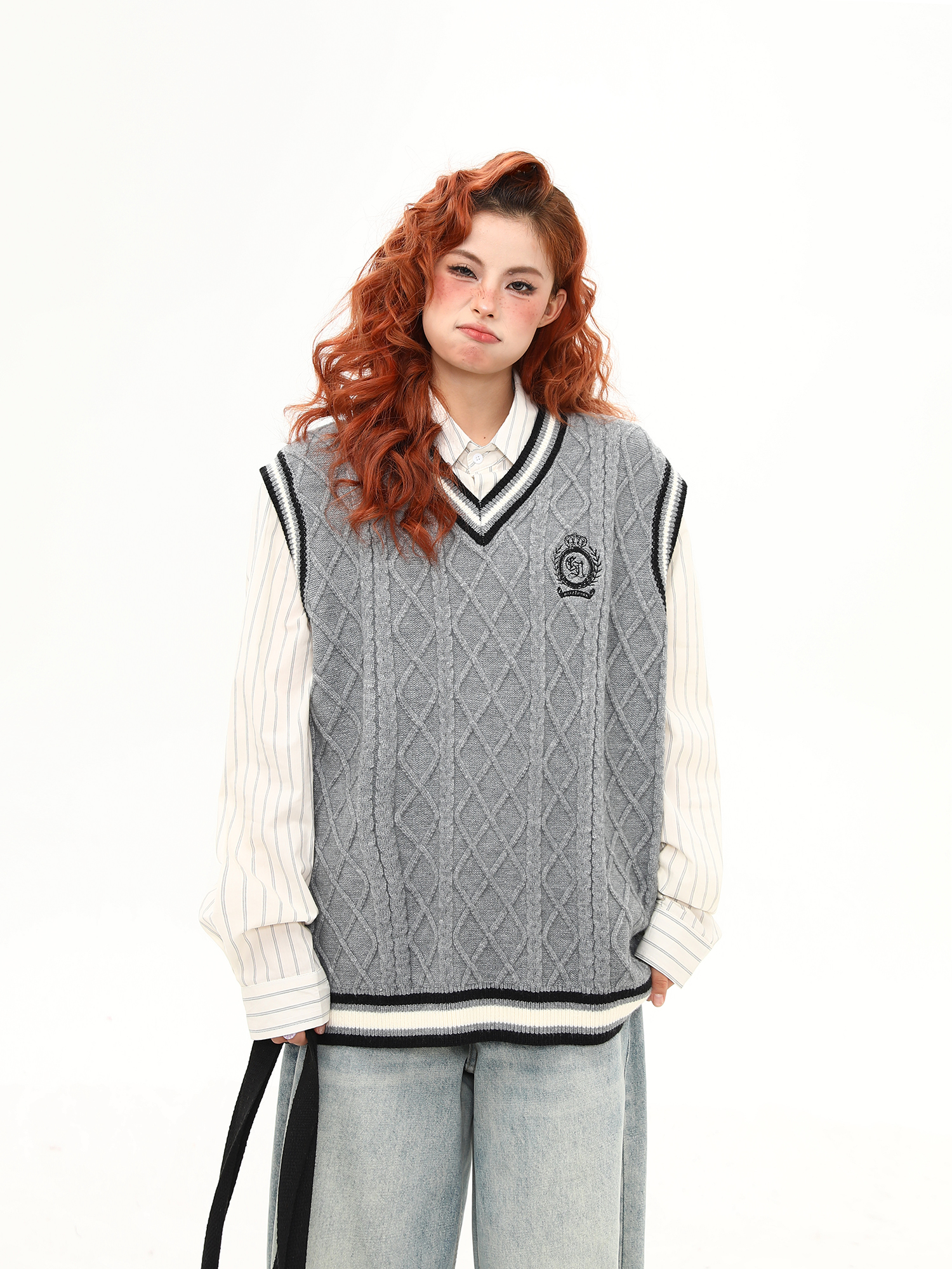 美式復古學院風刺繡美拉德馬甲背心毛衣女秋冬寬鬆針織衫