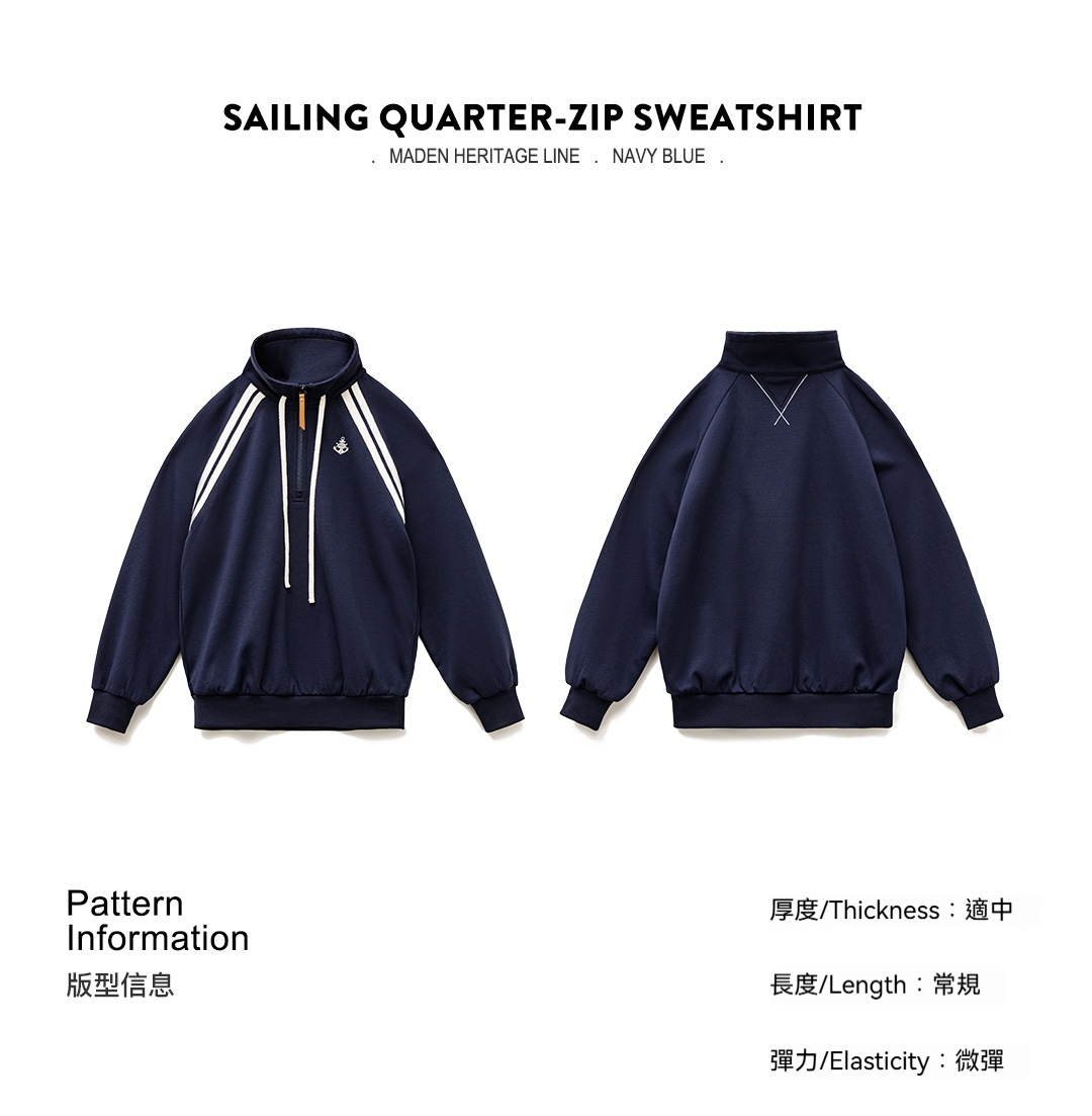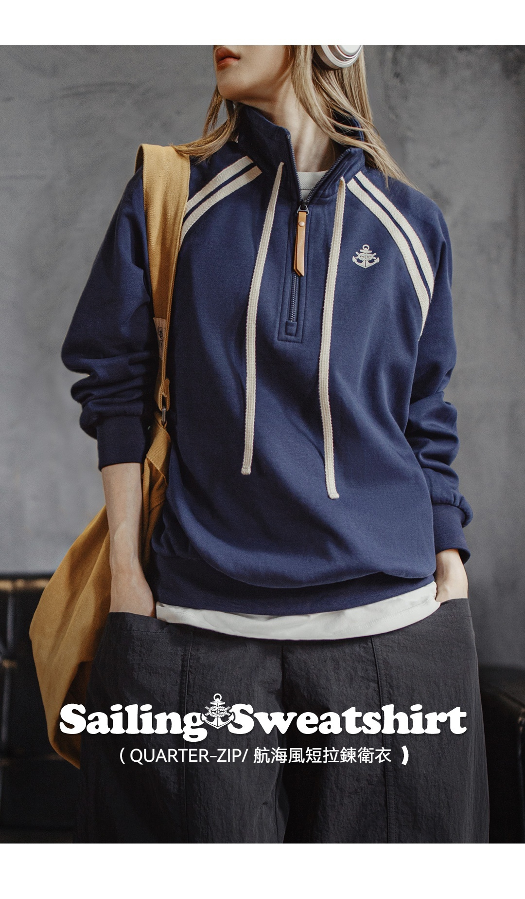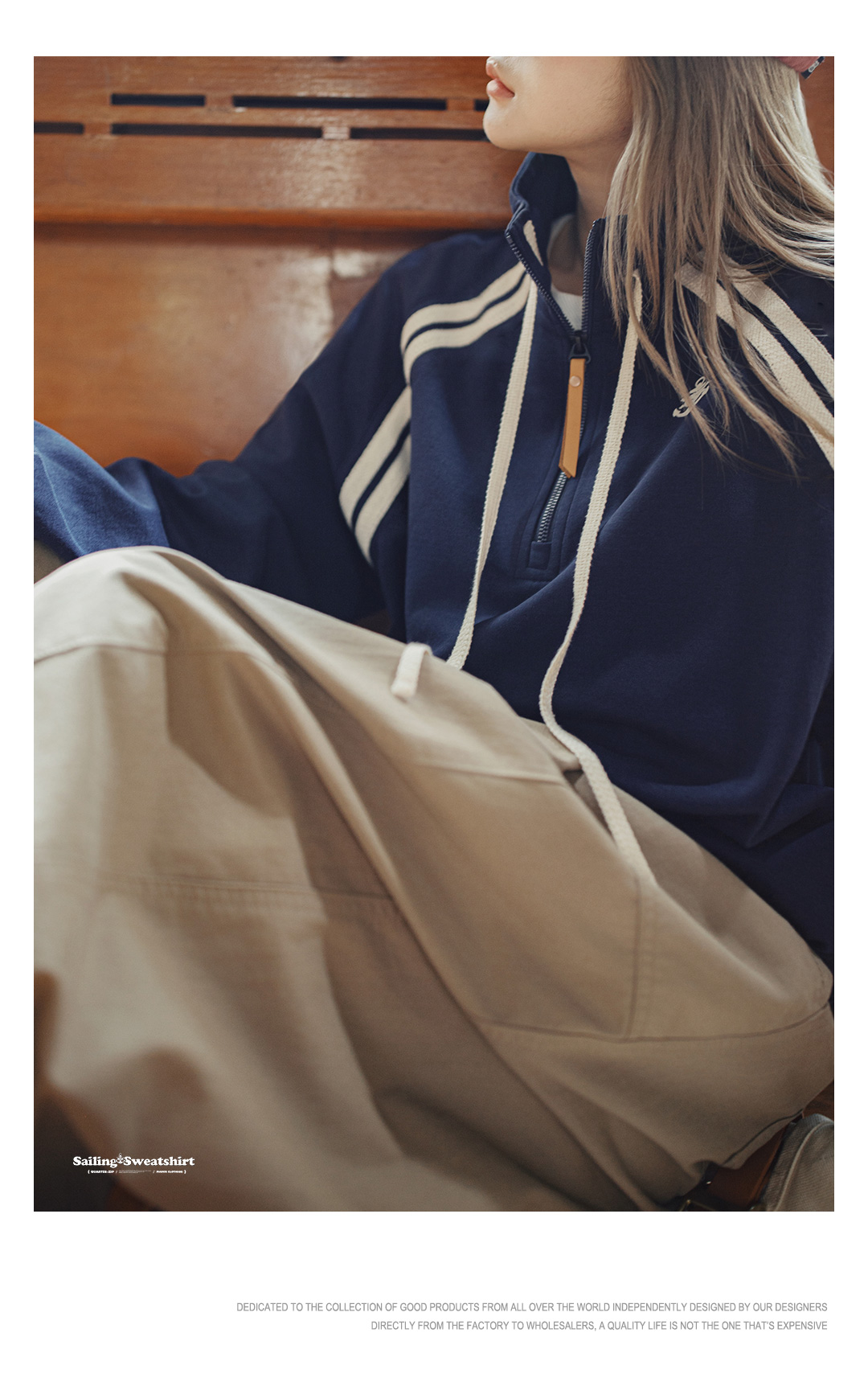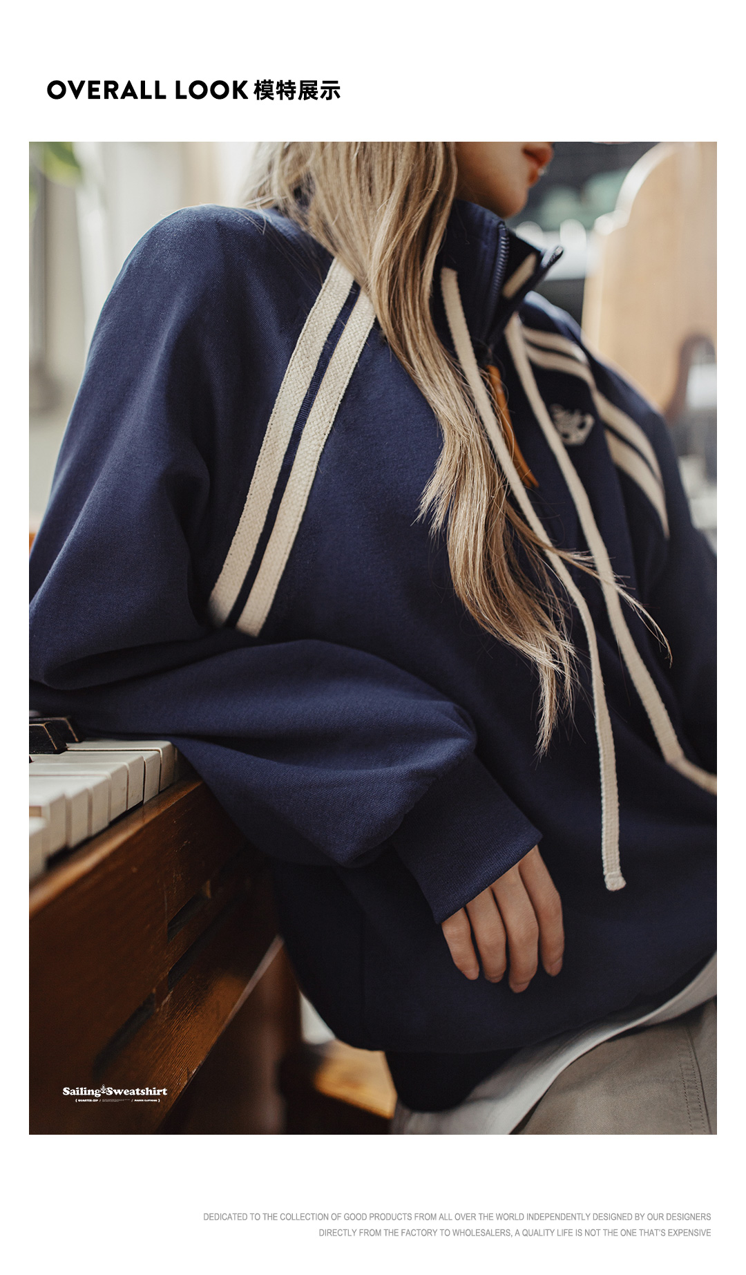 美式復古學院風藏青色半拉鍊立翻高領套頭長袖無帽衛衣女士秋