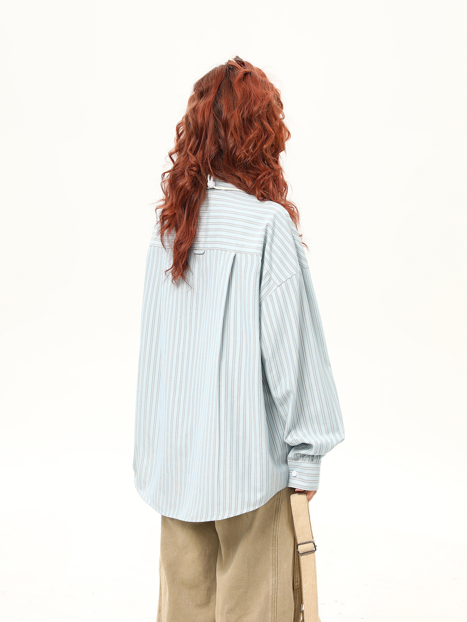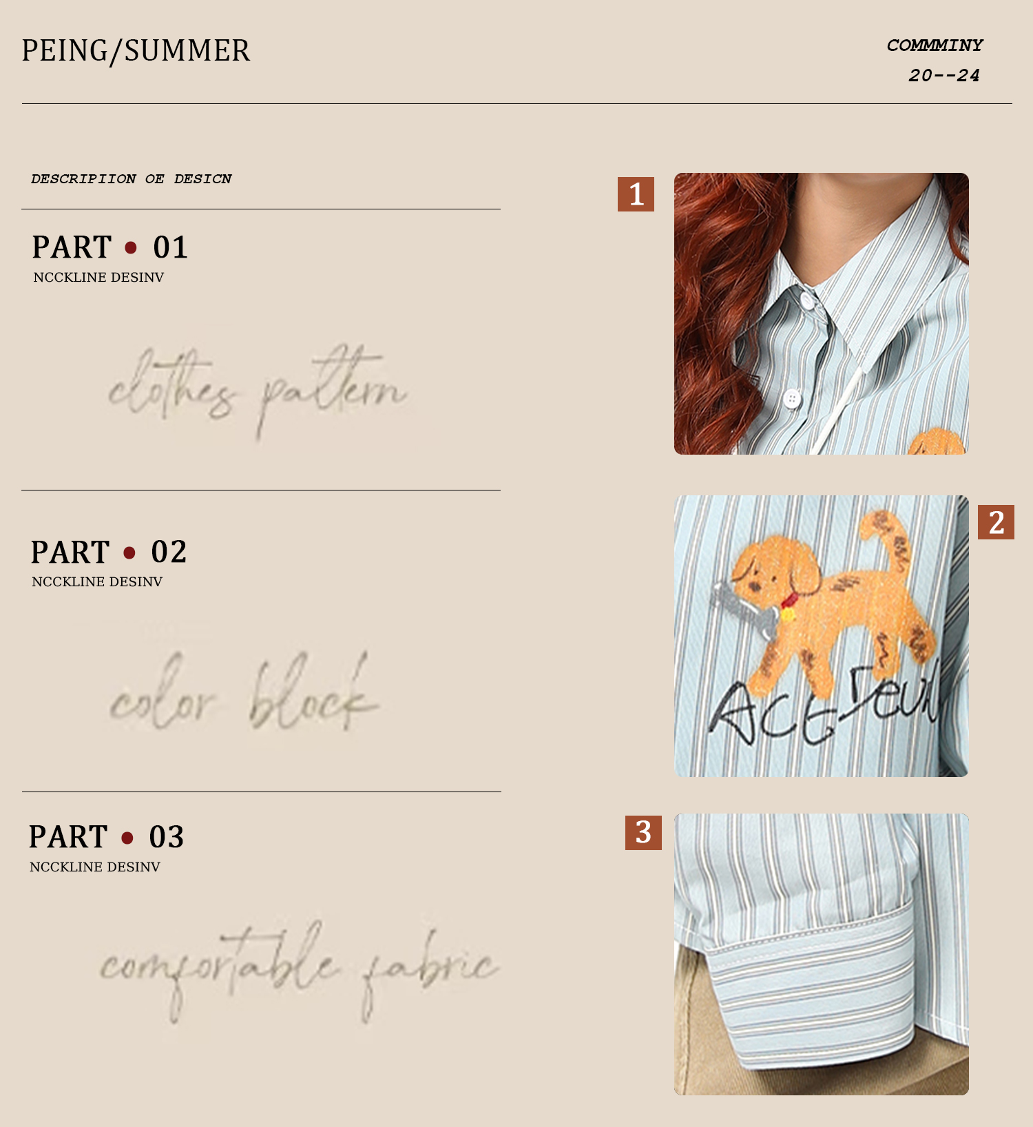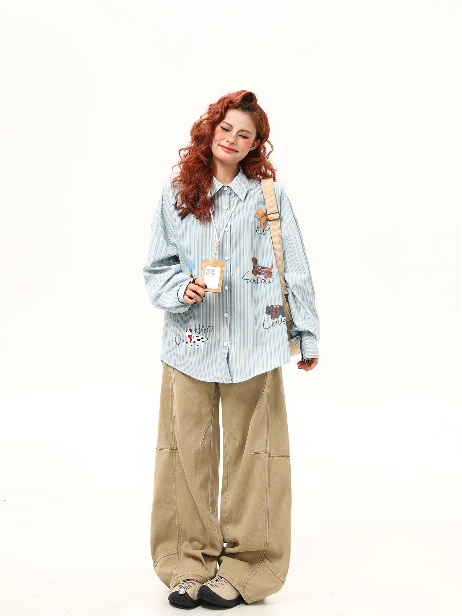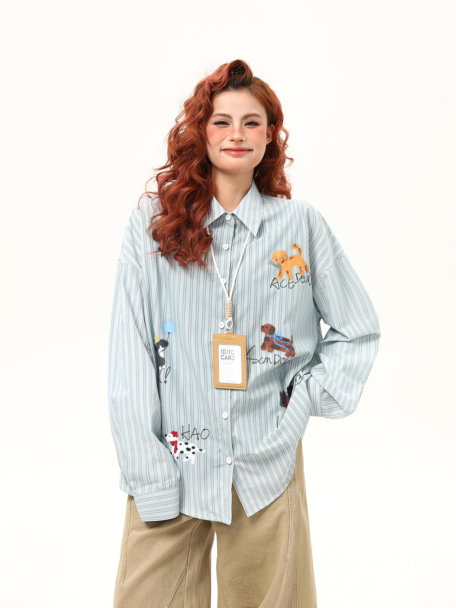 美式復古小狗印花豎條紋長袖襯衫女早秋寬鬆百搭襯衣