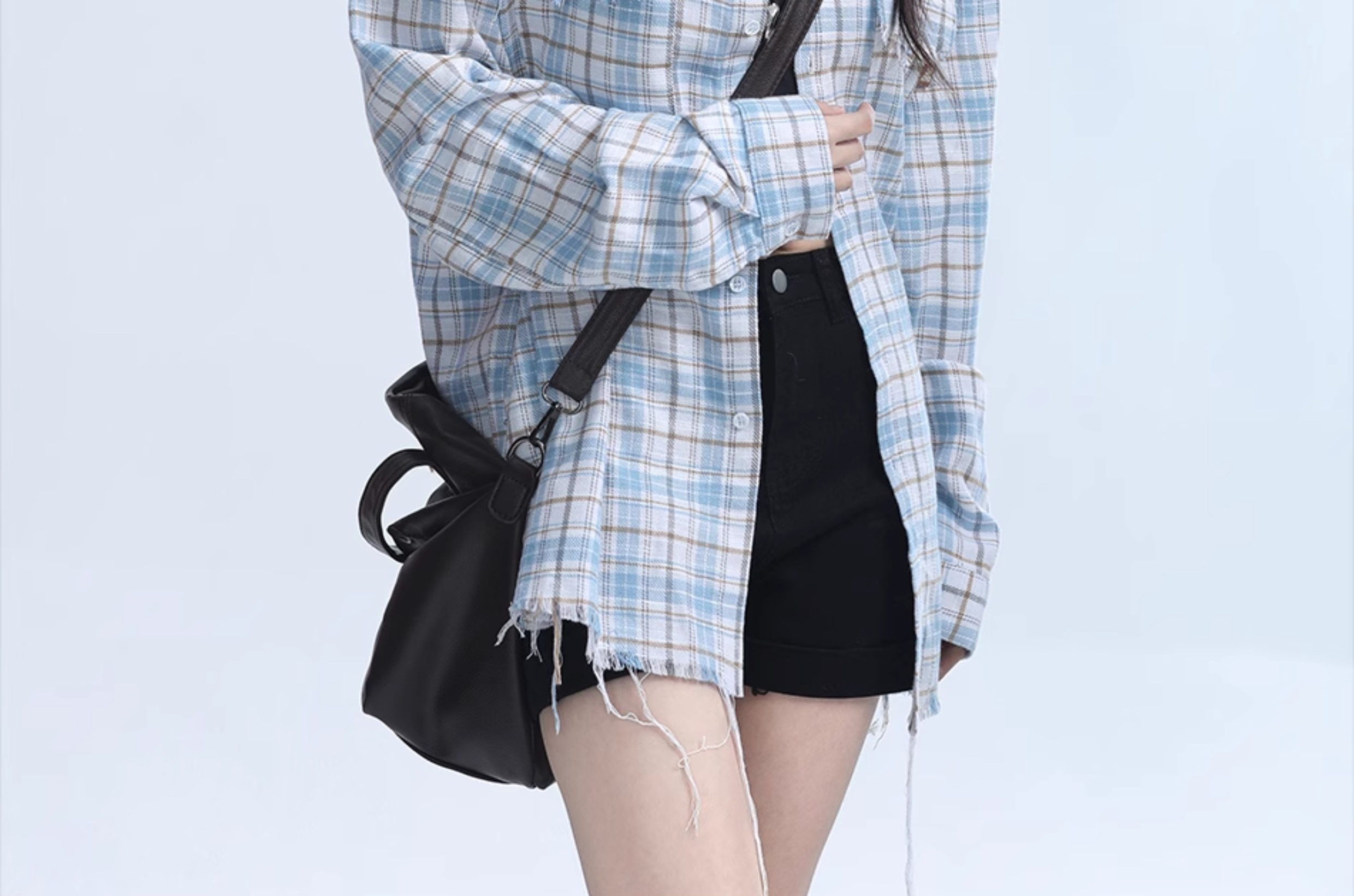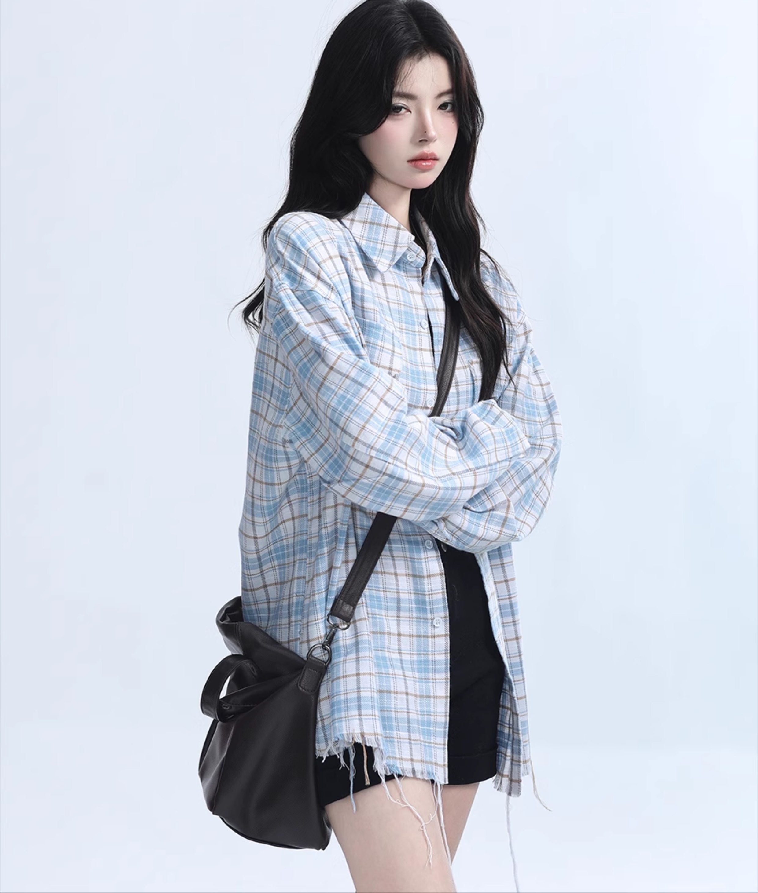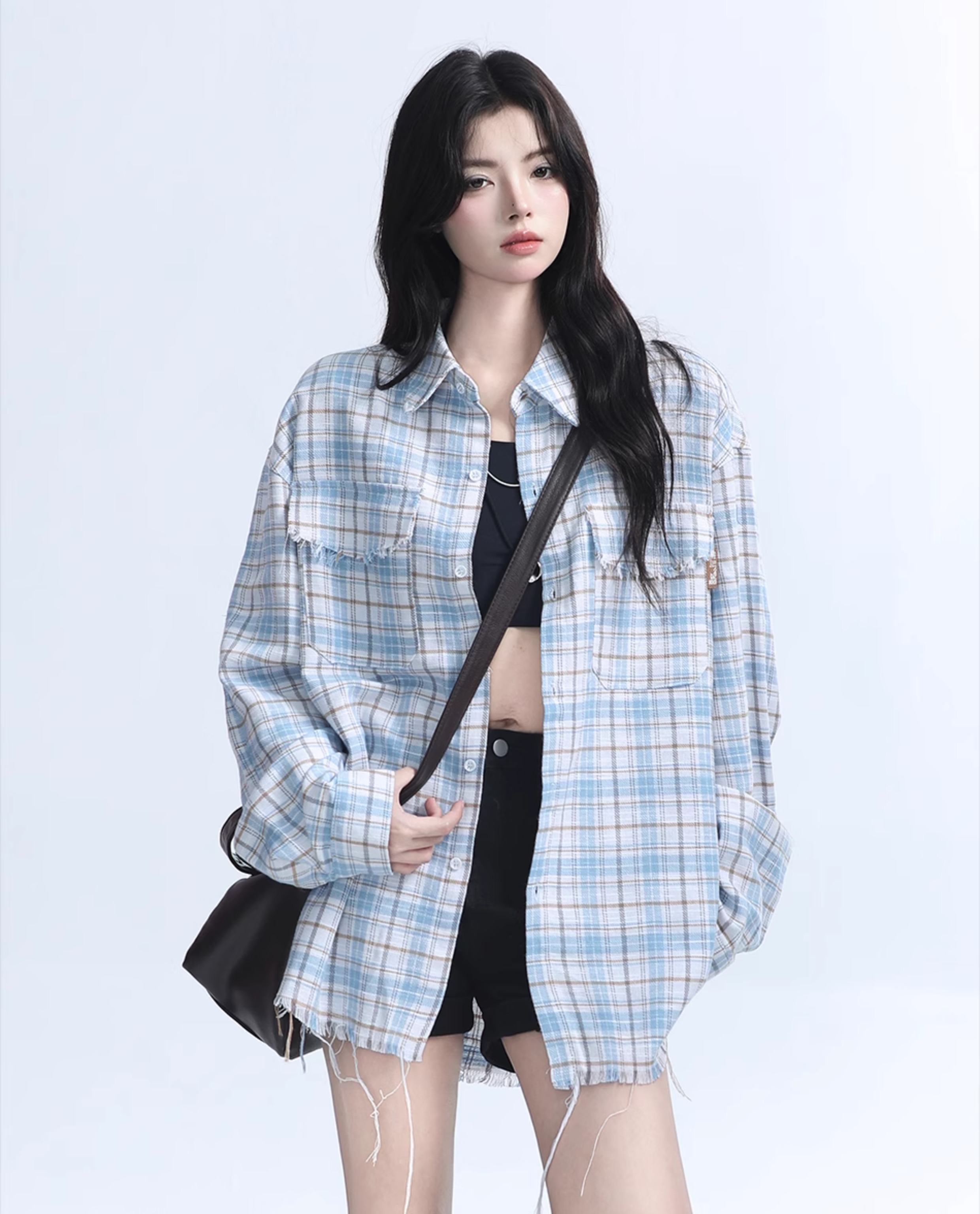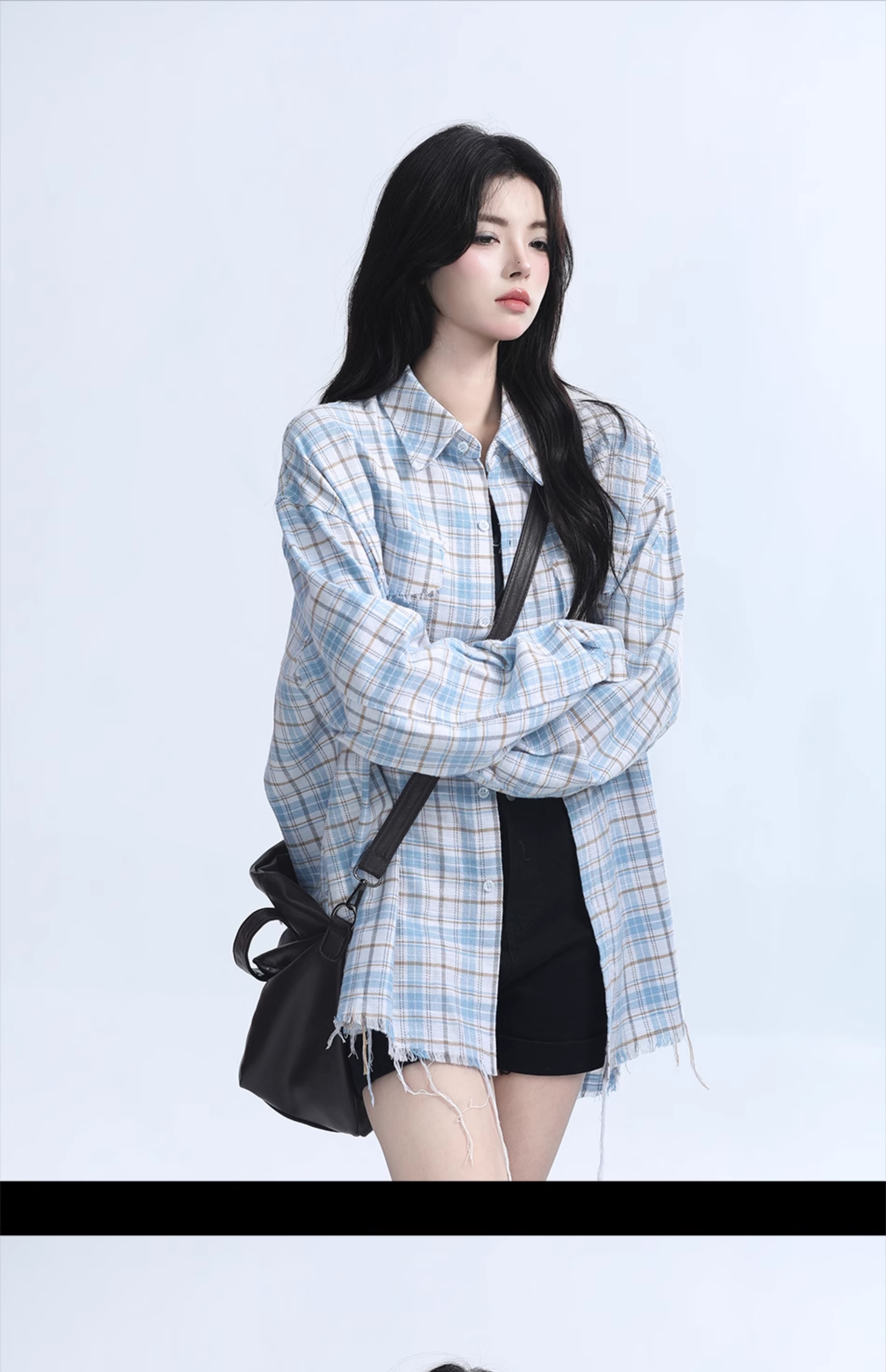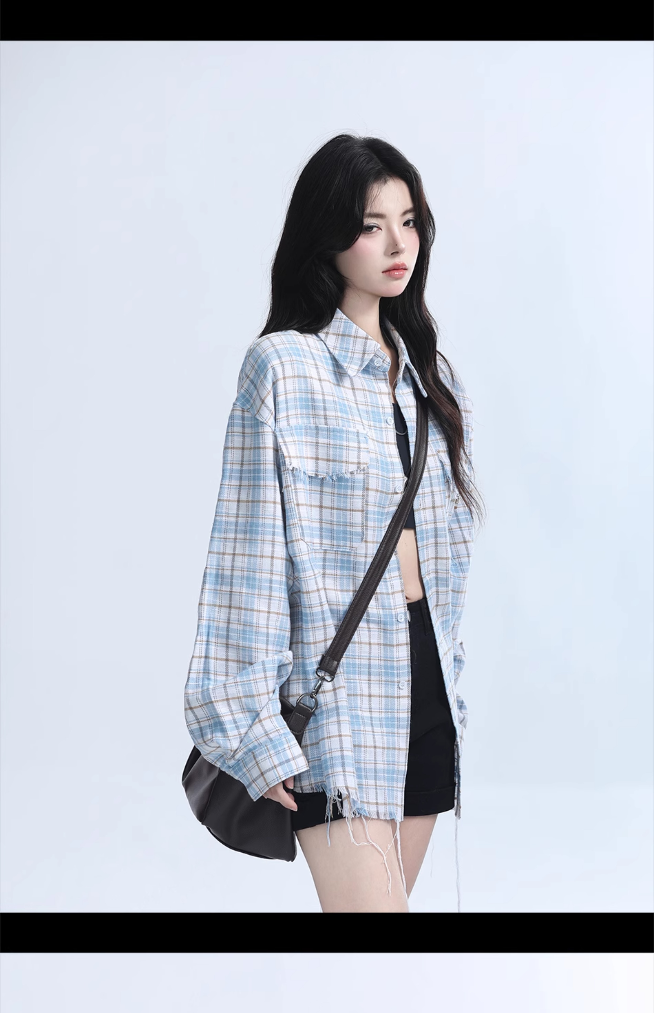 美式復古毛邊格子襯衫女設計感小眾寬鬆休閒襯衣女秋