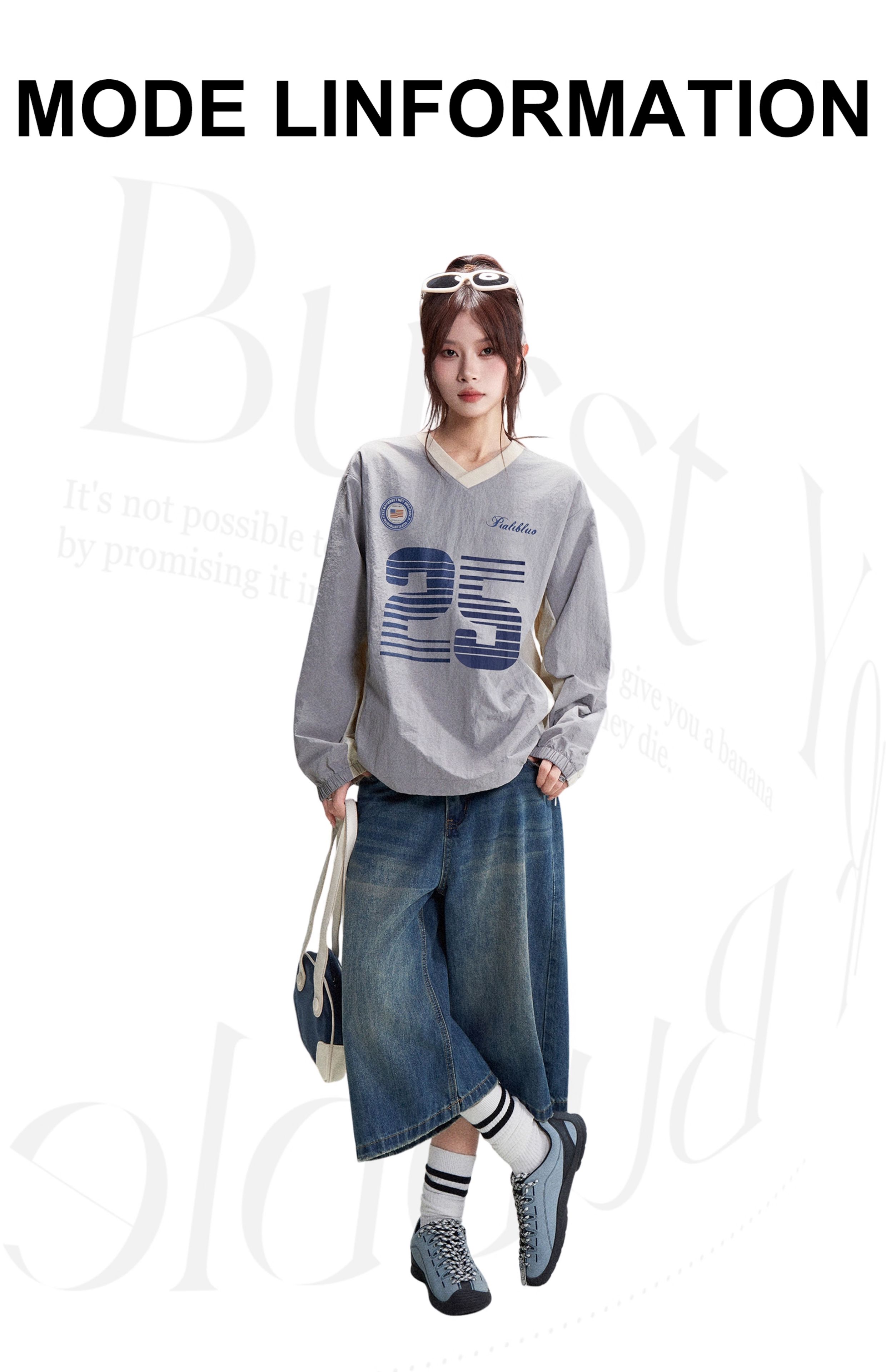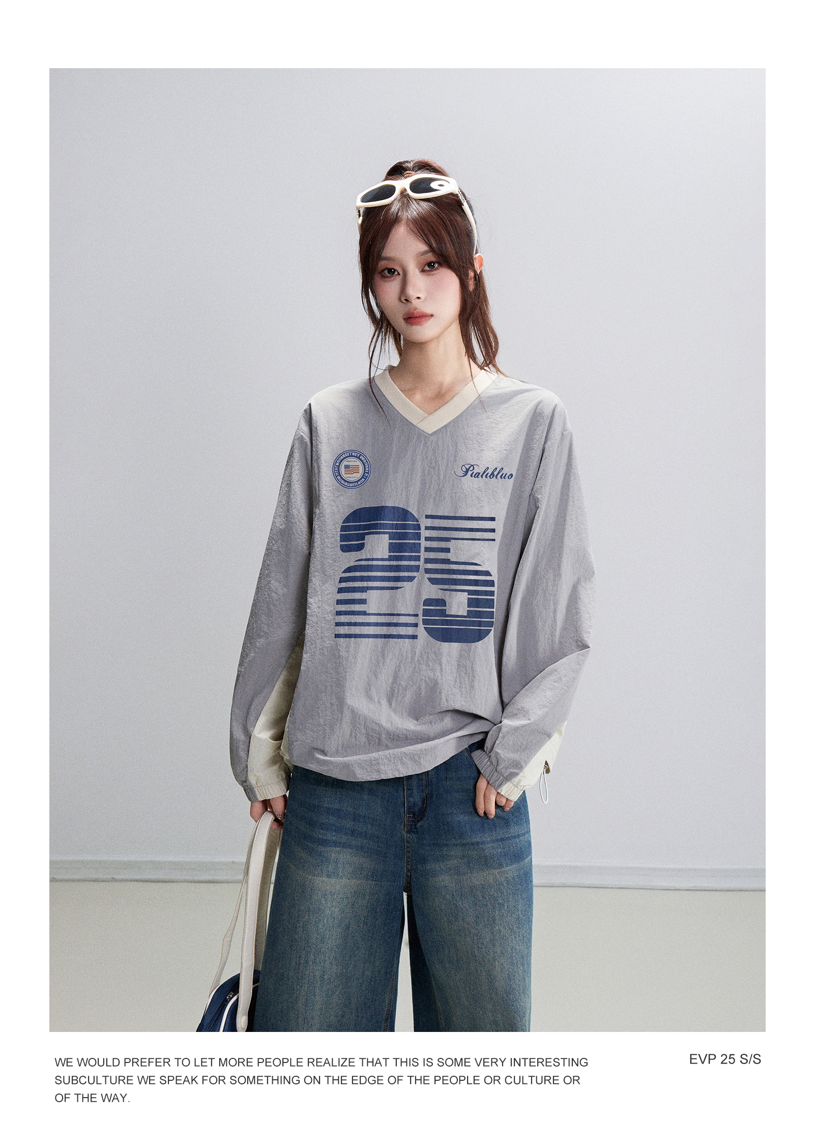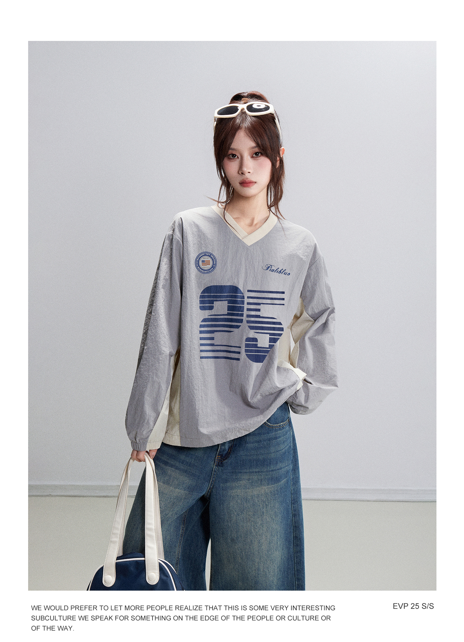 美式復古灰色v領正肩套頭長袖衛衣女秋季寬鬆運動設計感小眾上衣