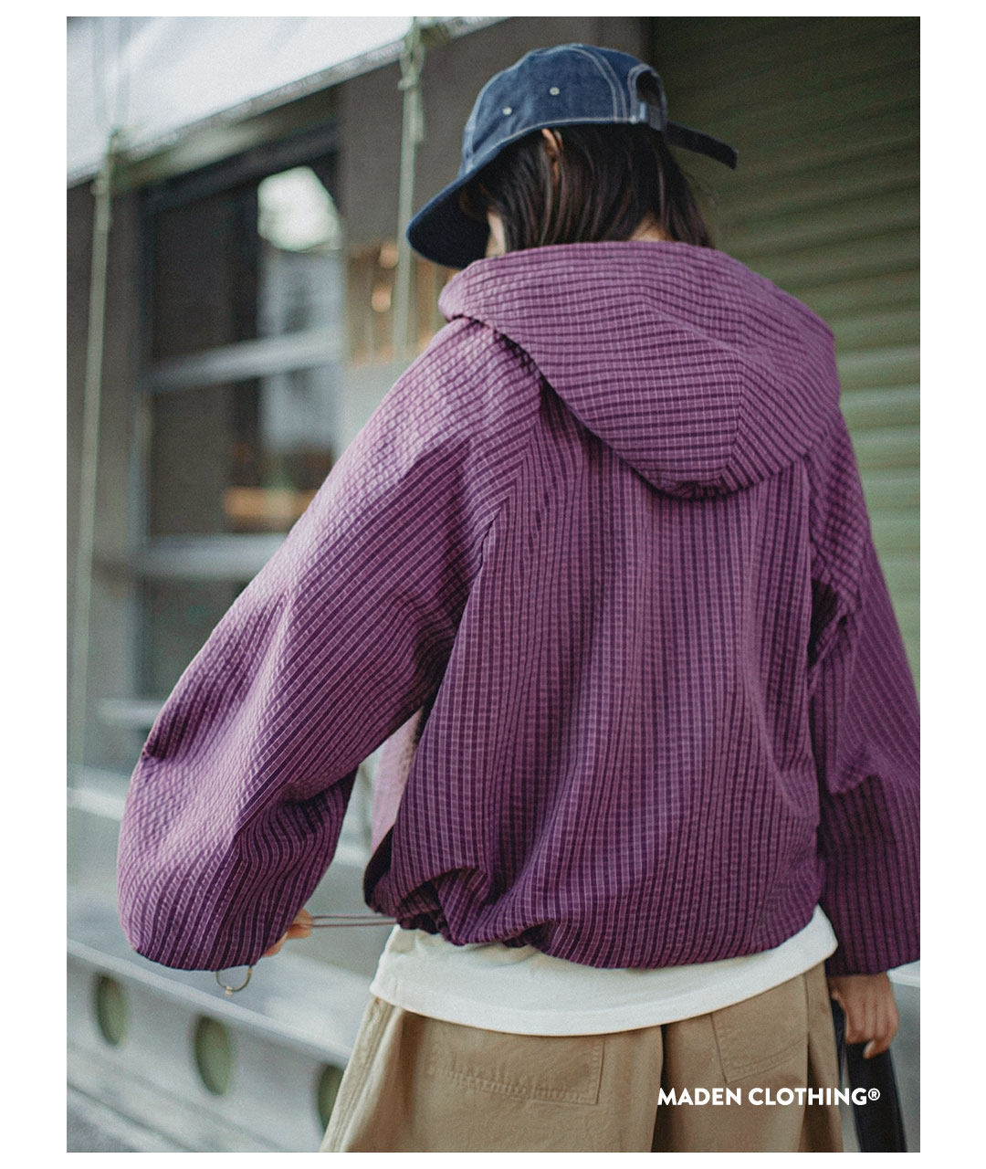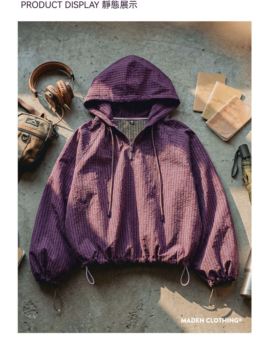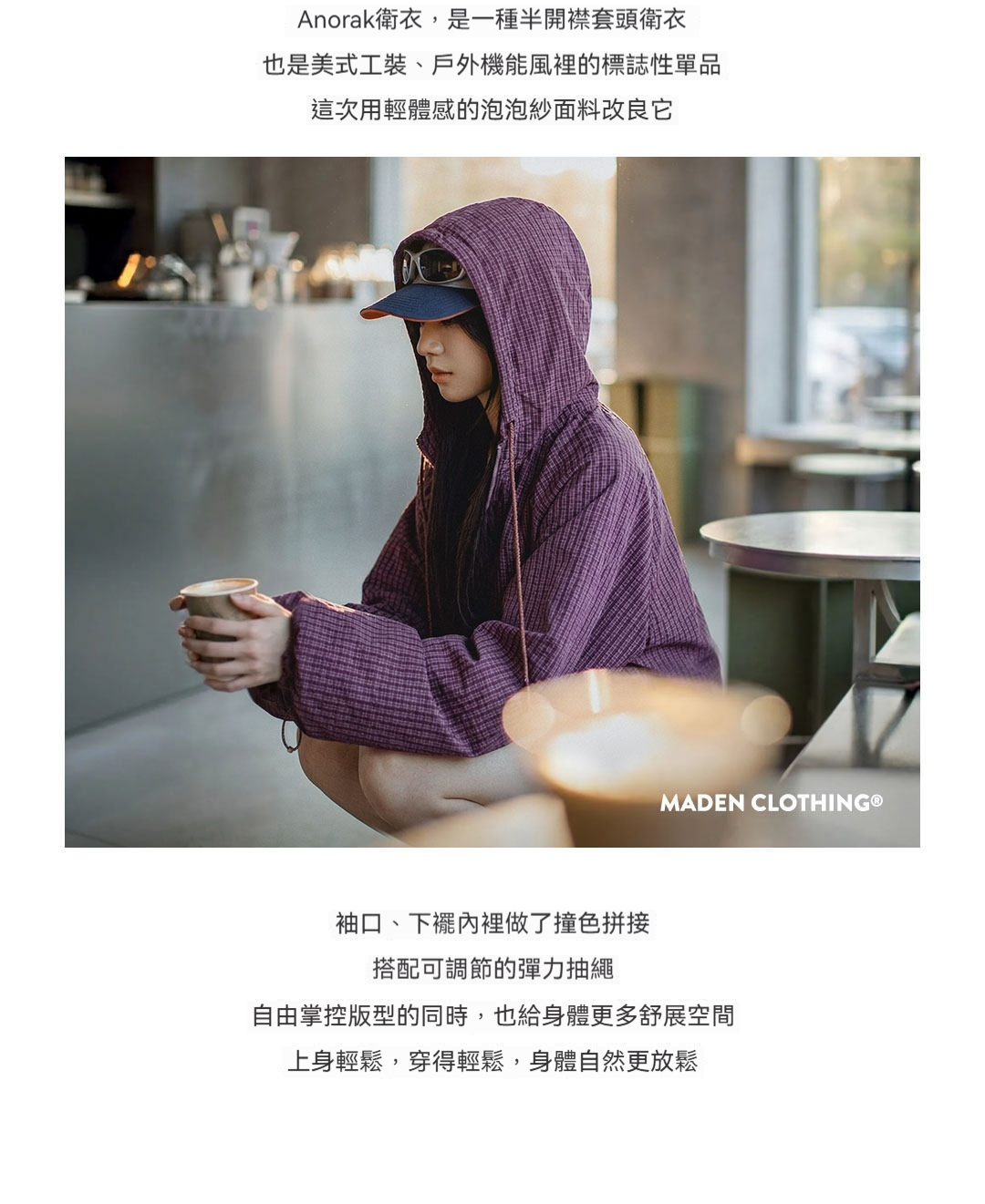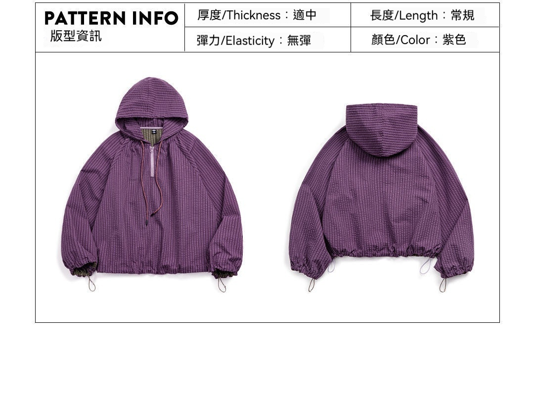 美式泡泡紗連帶帽半開襟工裝衛衣套頭衫寬鬆機能風上衣女士春