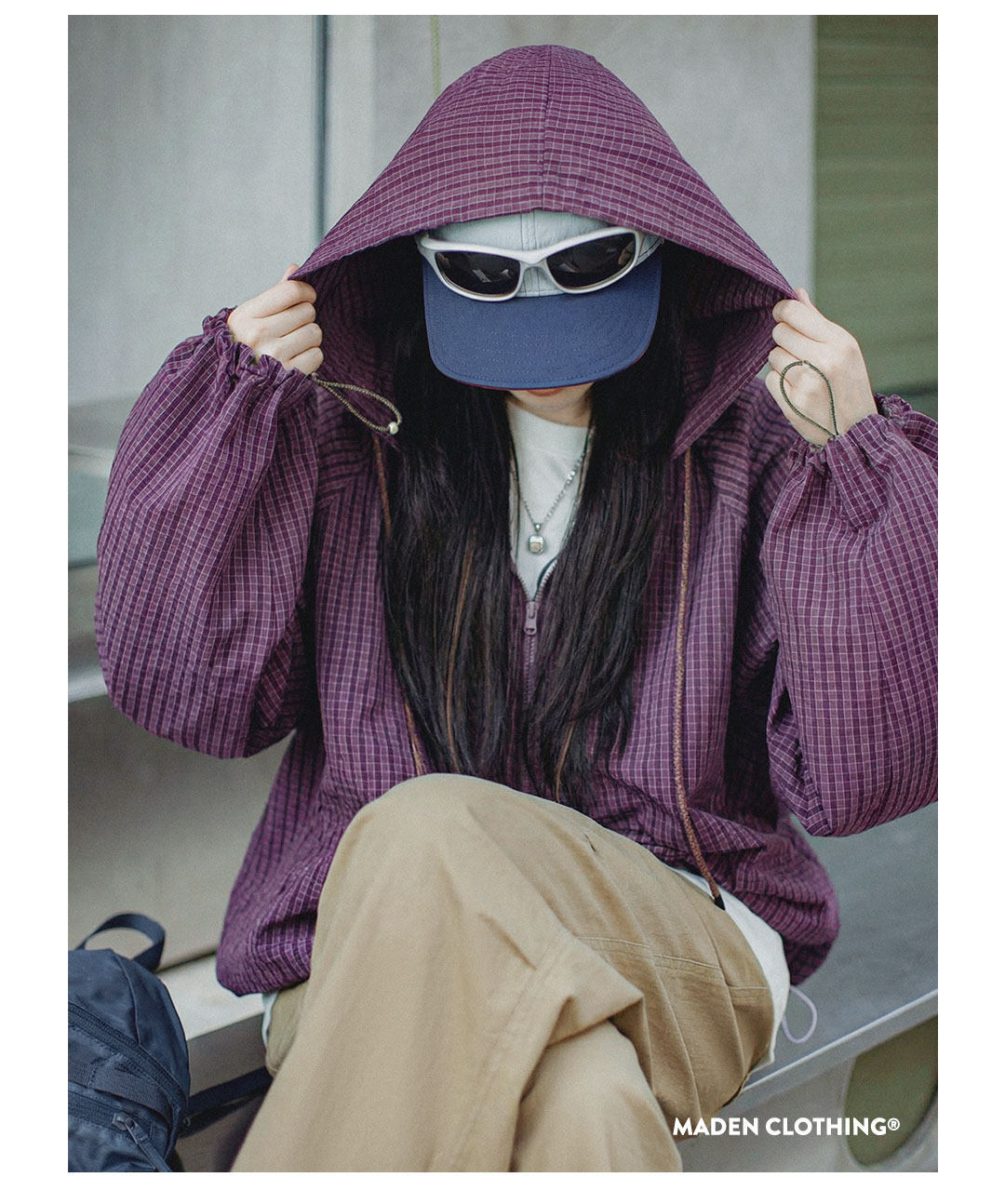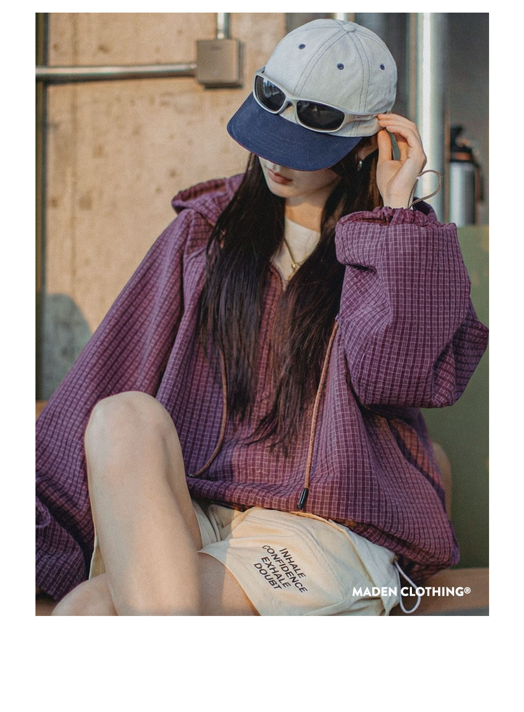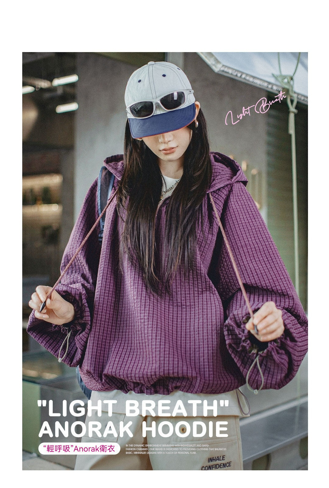 美式泡泡紗連帶帽半開襟工裝衛衣套頭衫寬鬆機能風上衣女士春