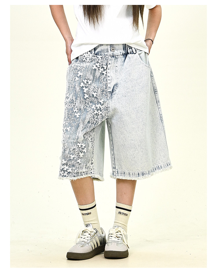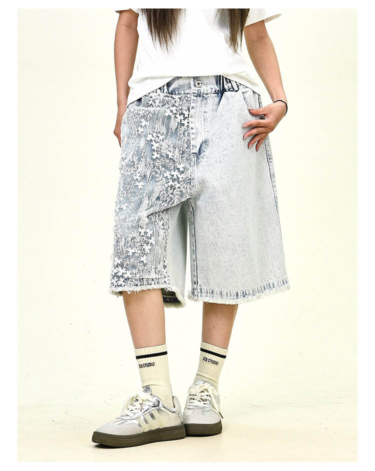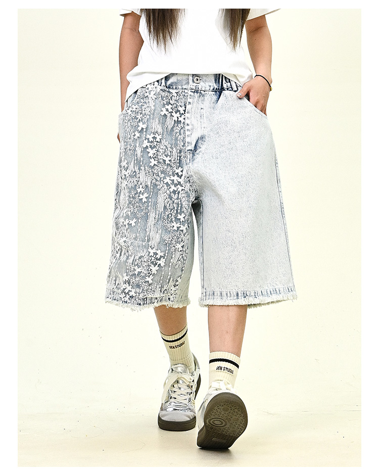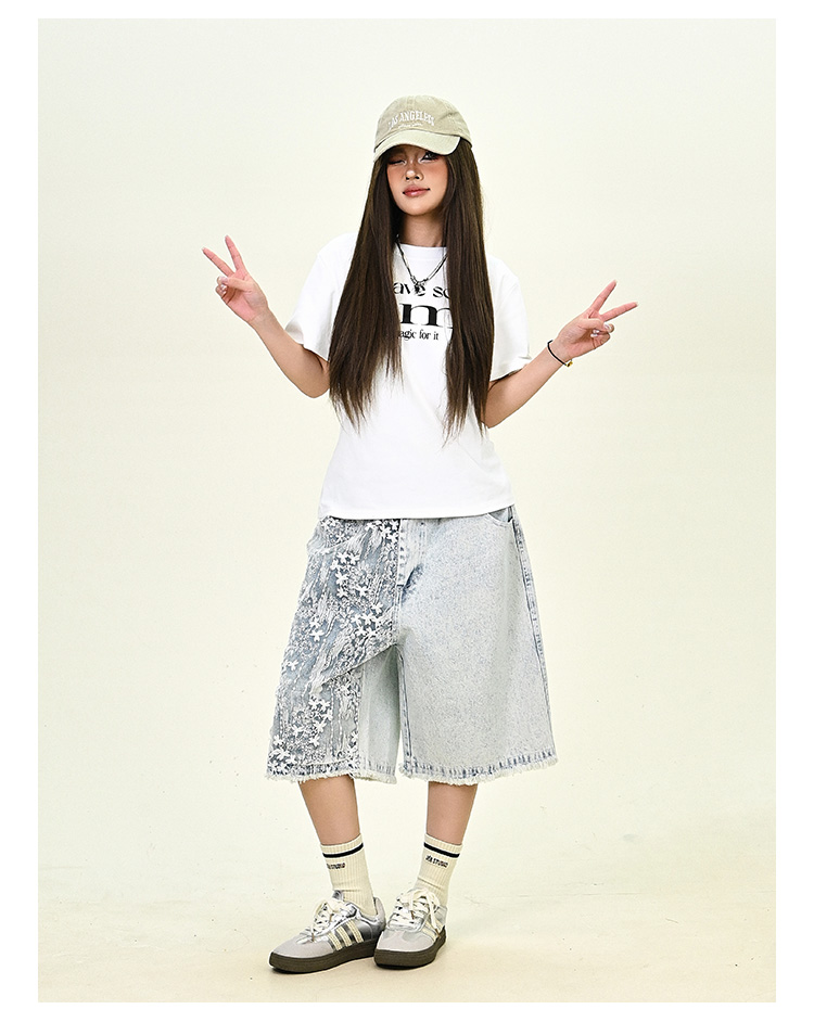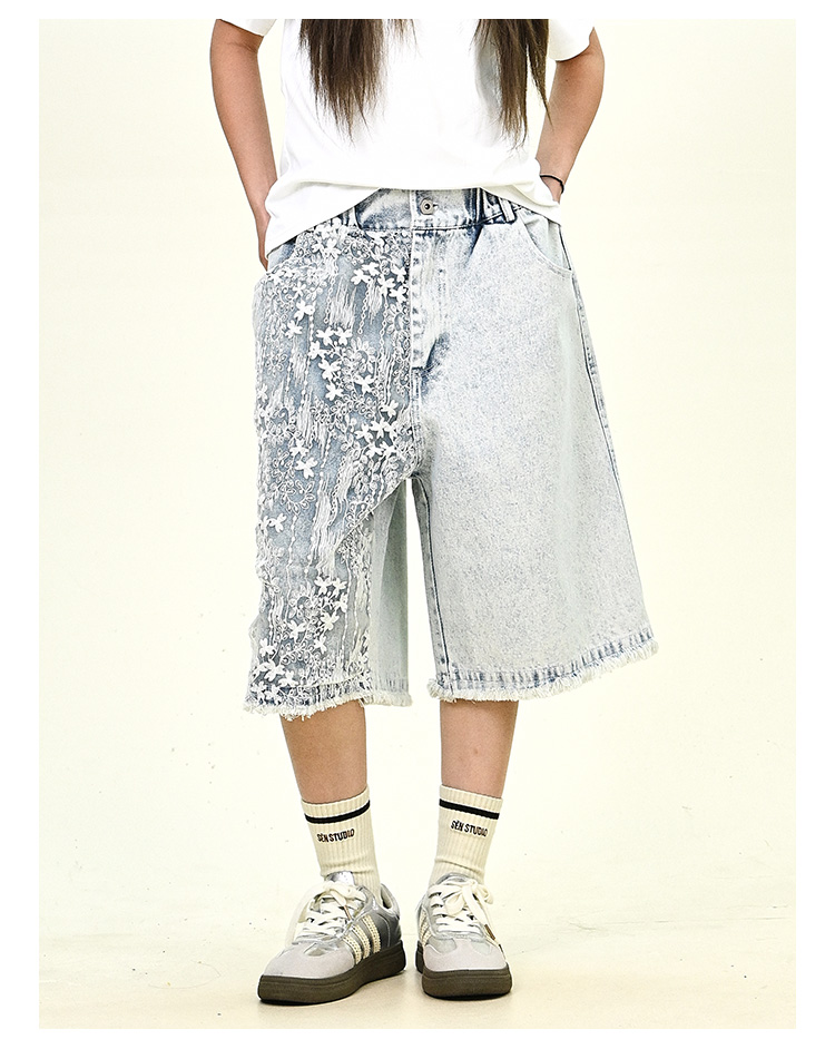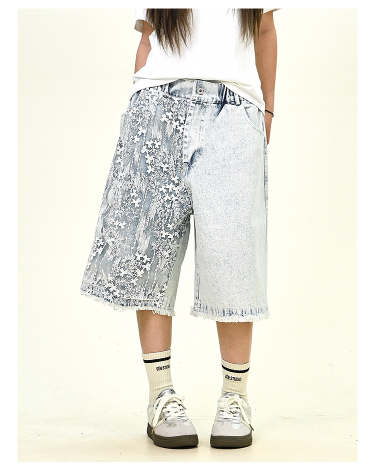 蕾絲拼接毛邊牛仔褲女2025夏季新款寬鬆bf美式高街七分褲