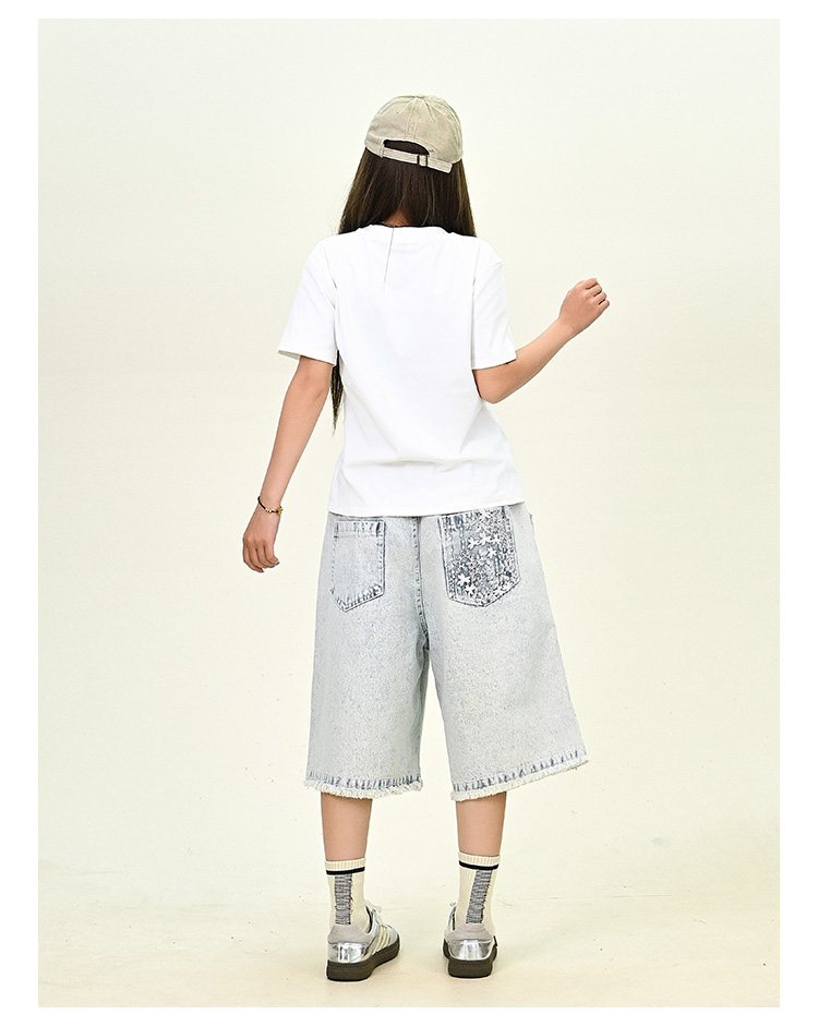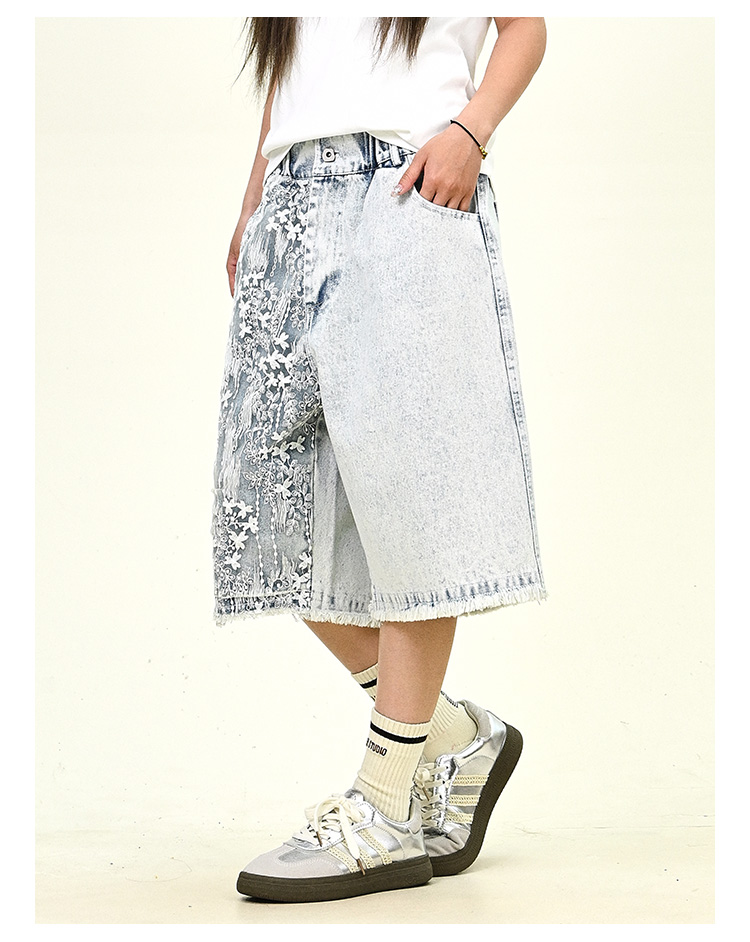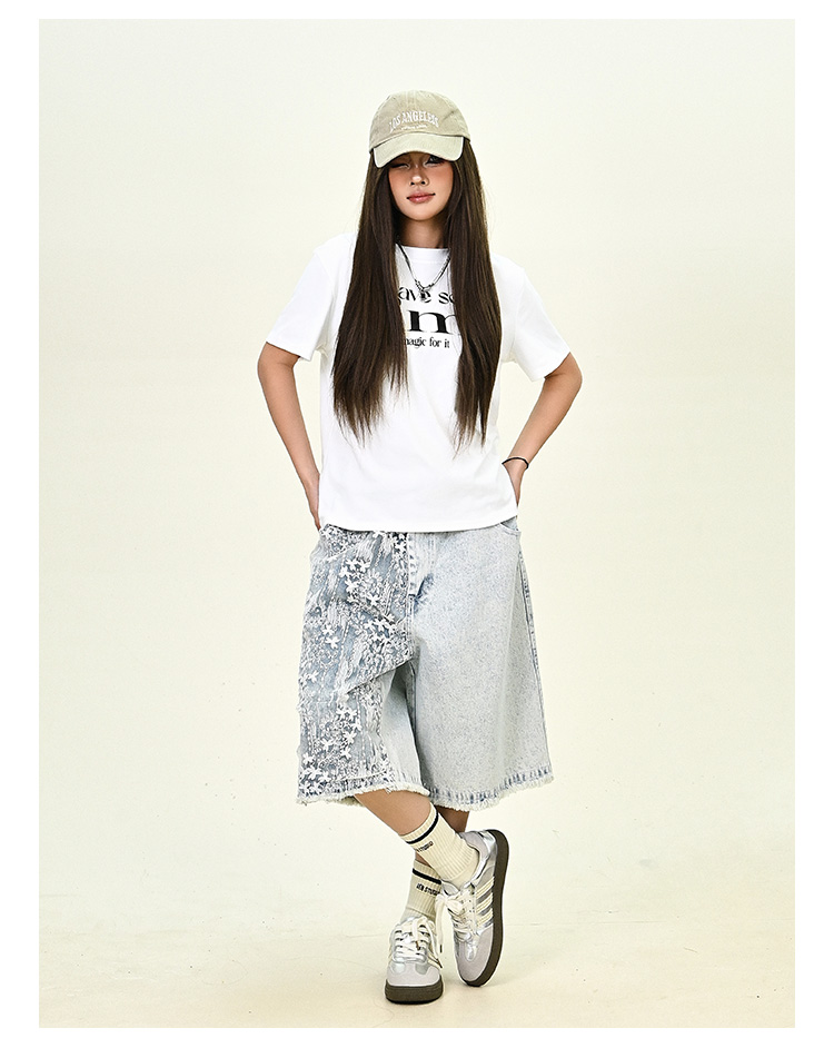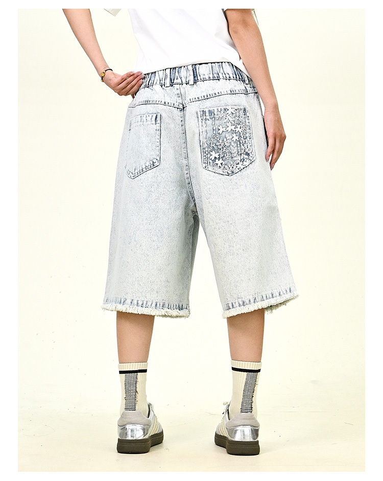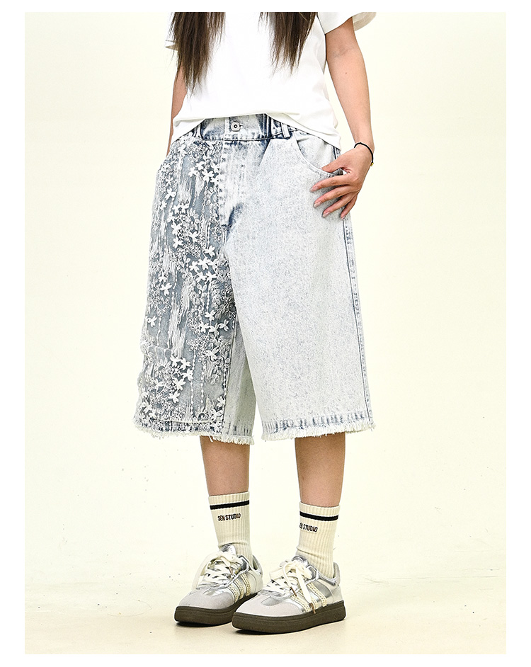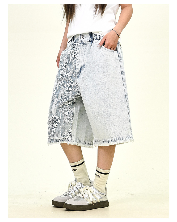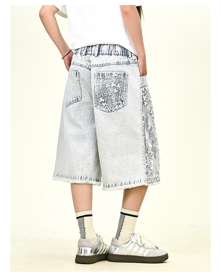 蕾絲拼接毛邊牛仔褲女2025夏季新款寬鬆bf美式高街七分褲