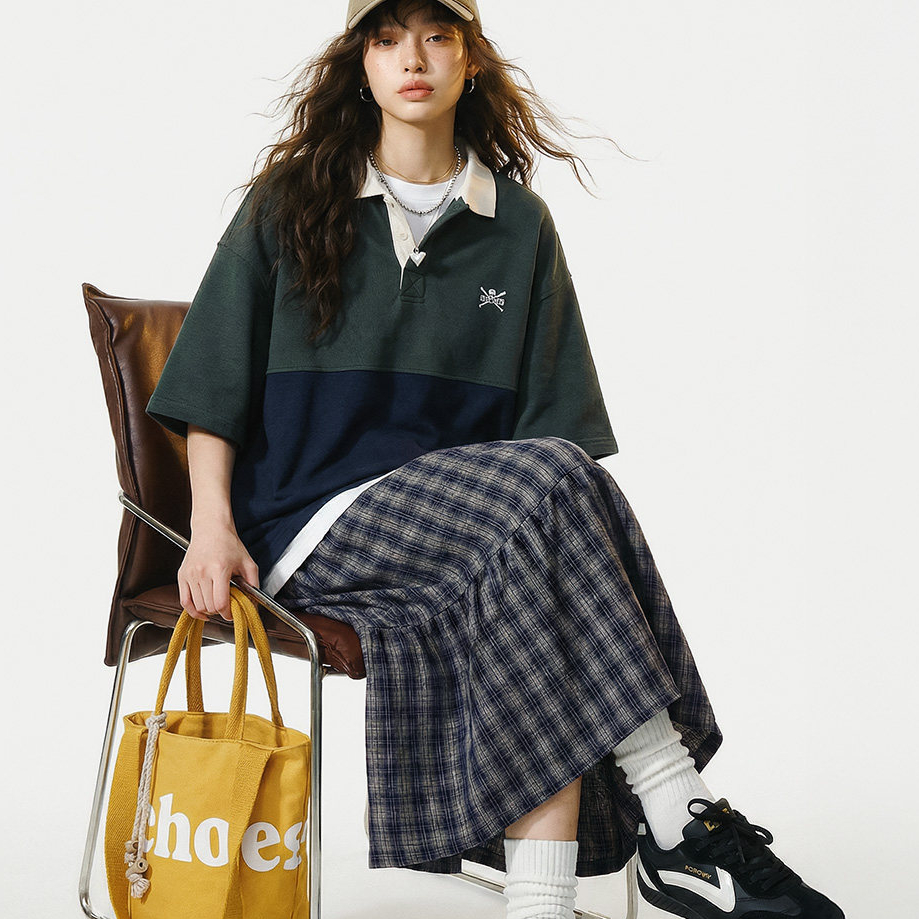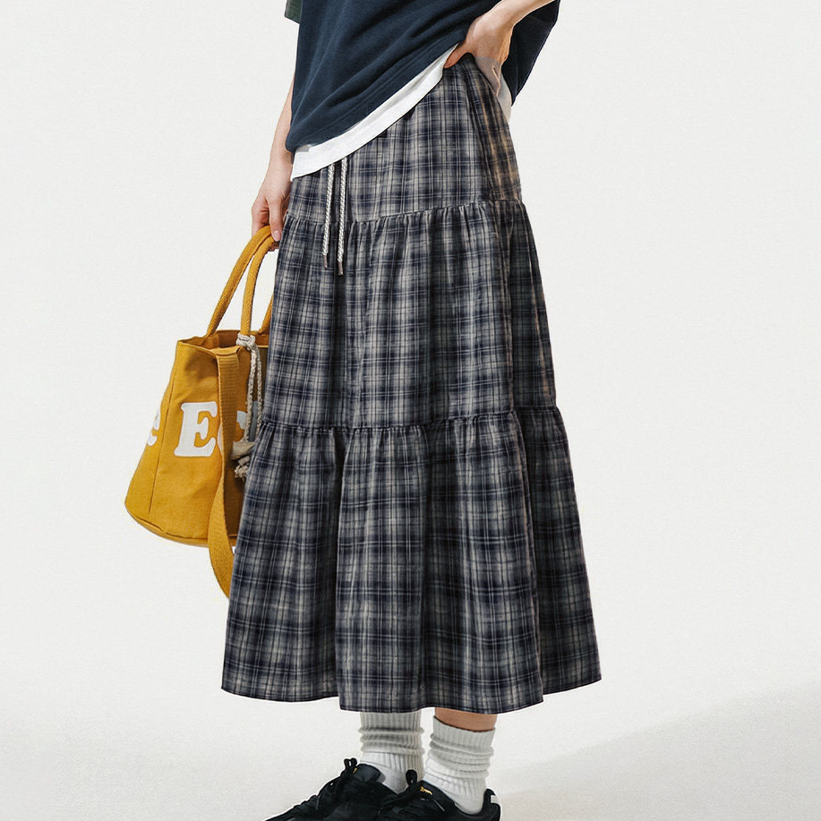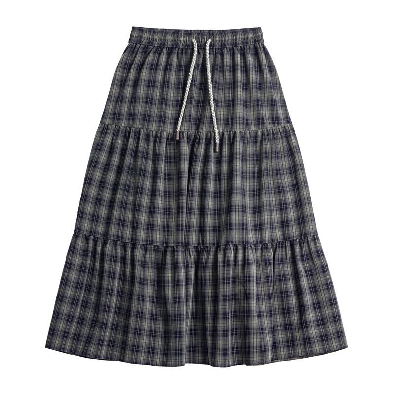藍綠色復古鬆緊a字蛋糕裙日系百褶拼接格子紋半身長裙女士春