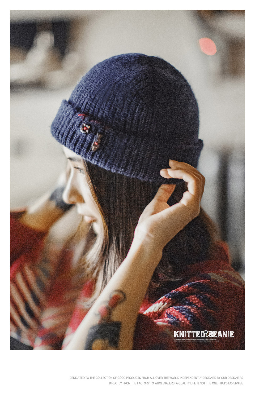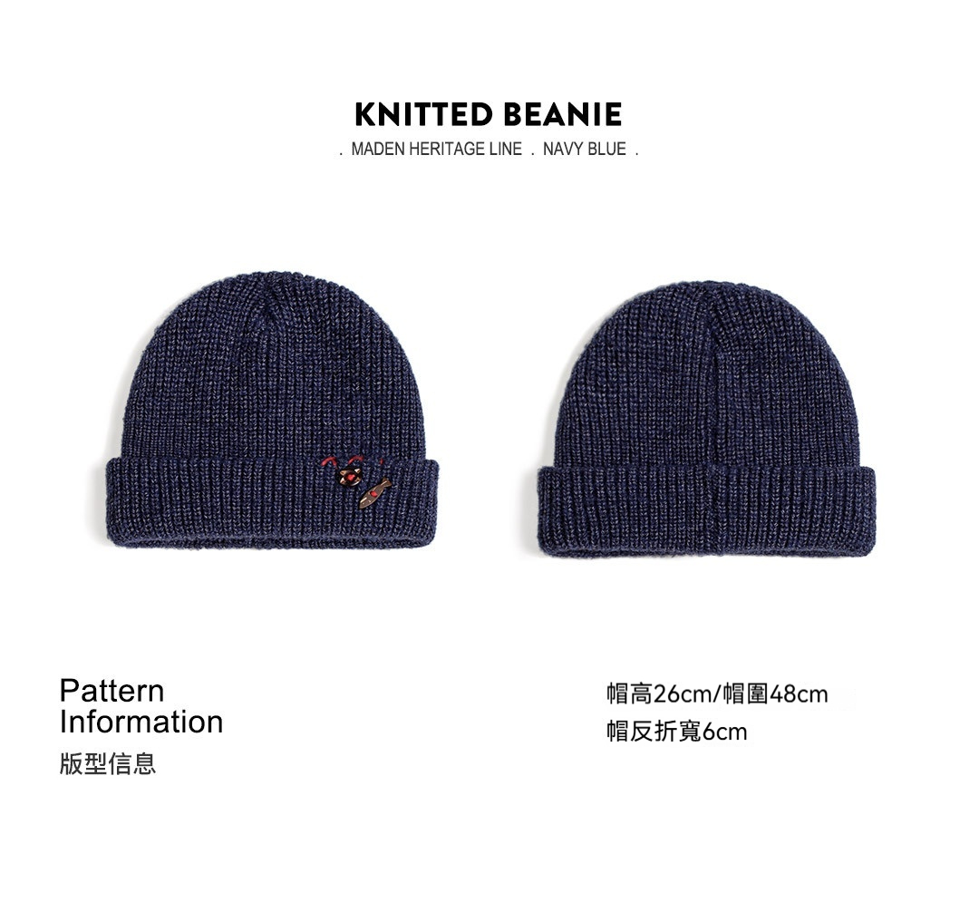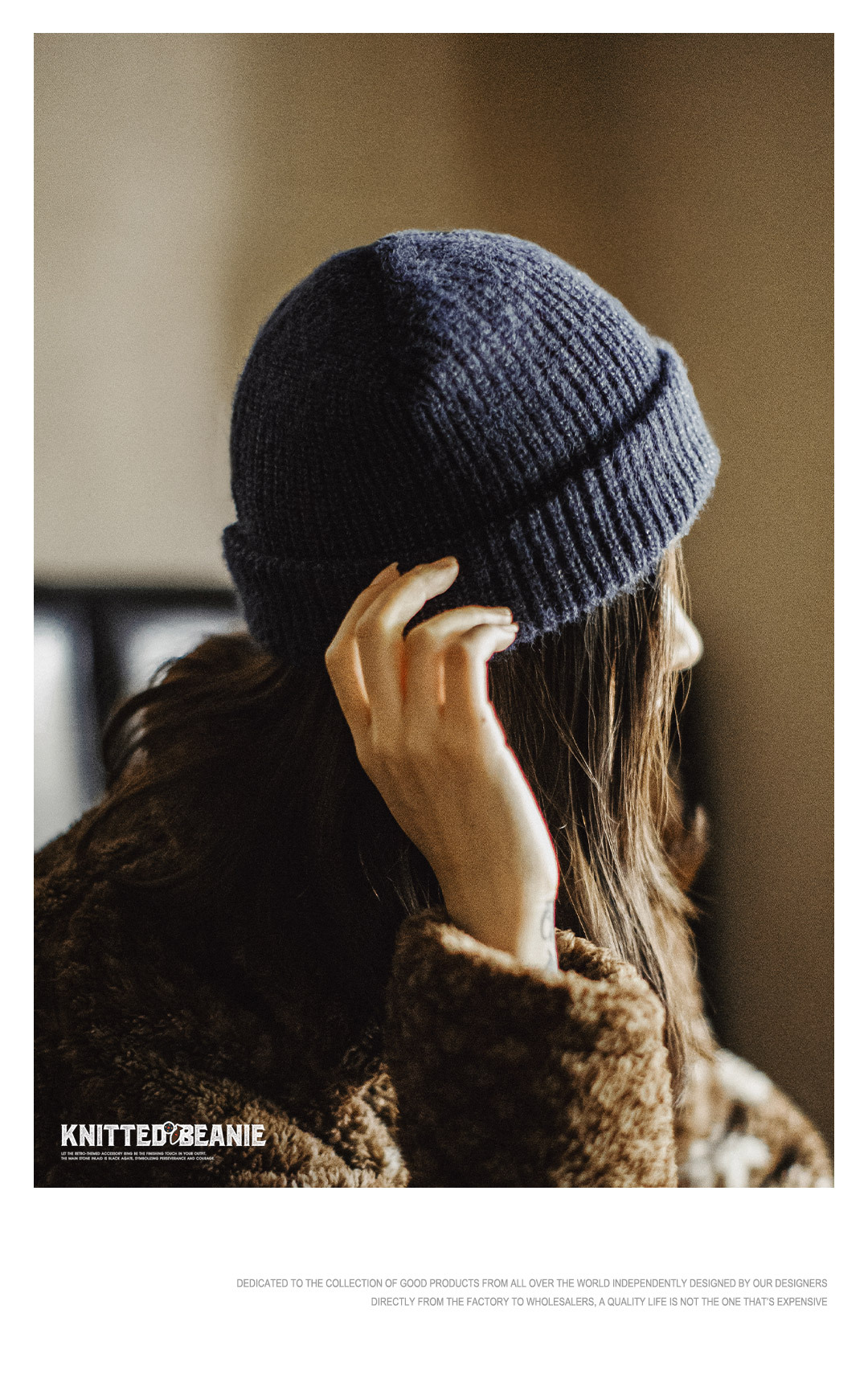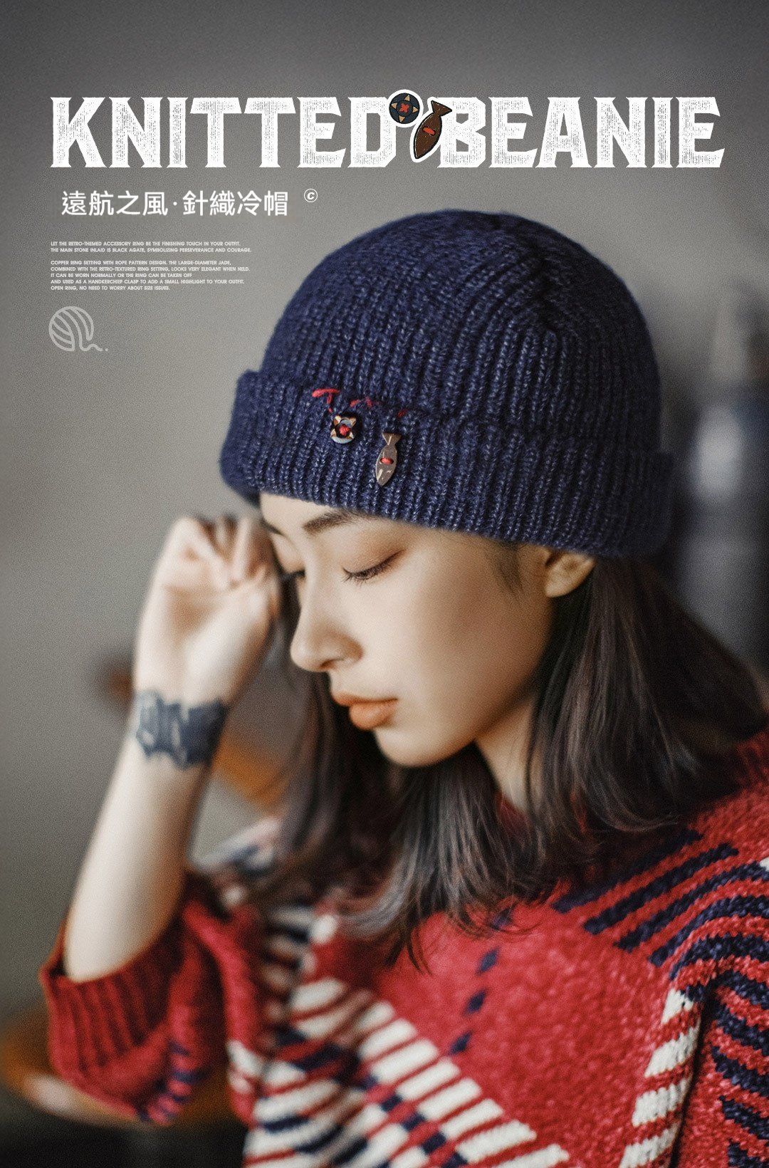 藏青色復古針織保暖加厚毛線冷帽子大頭圍防寒護耳瓜皮帽女冬