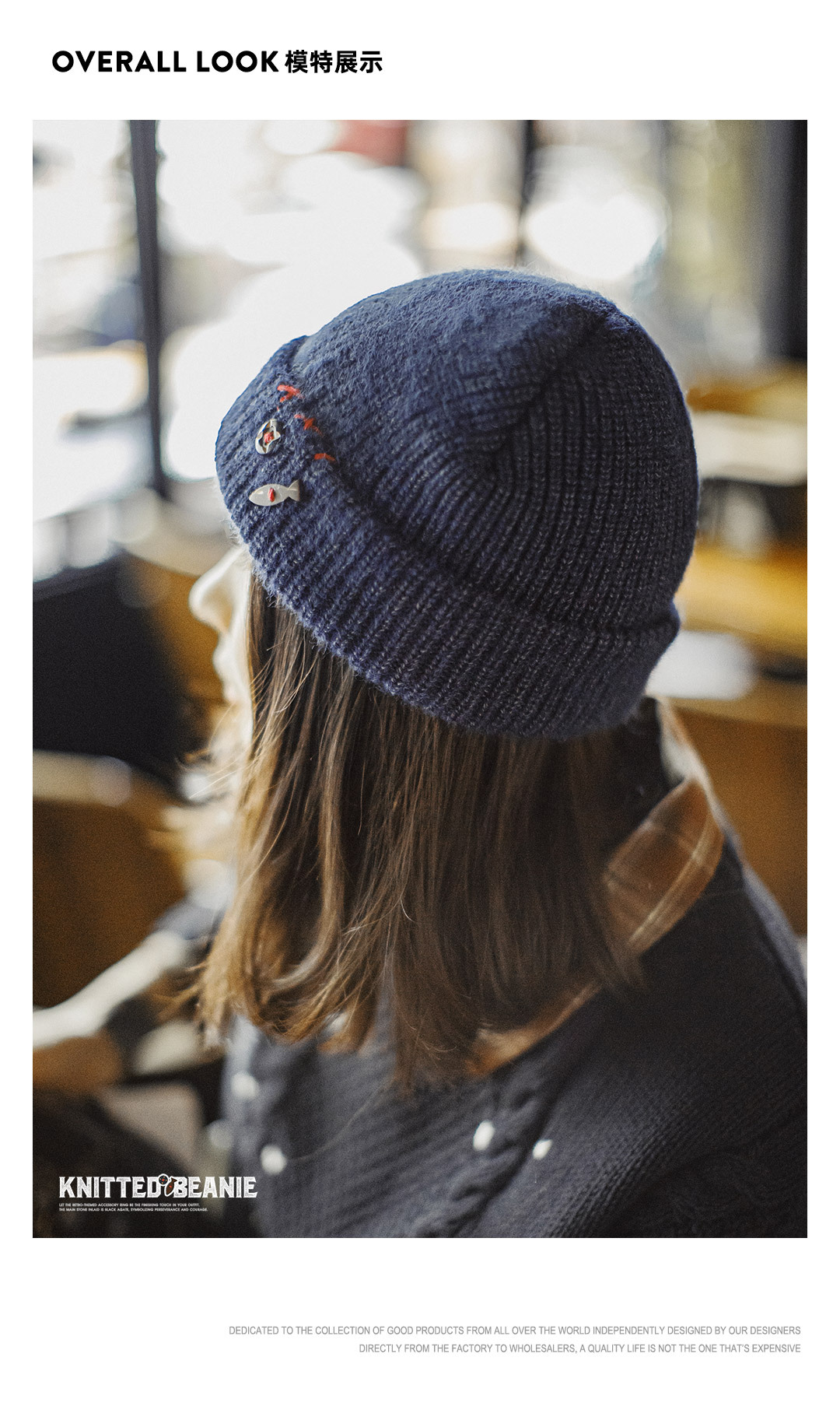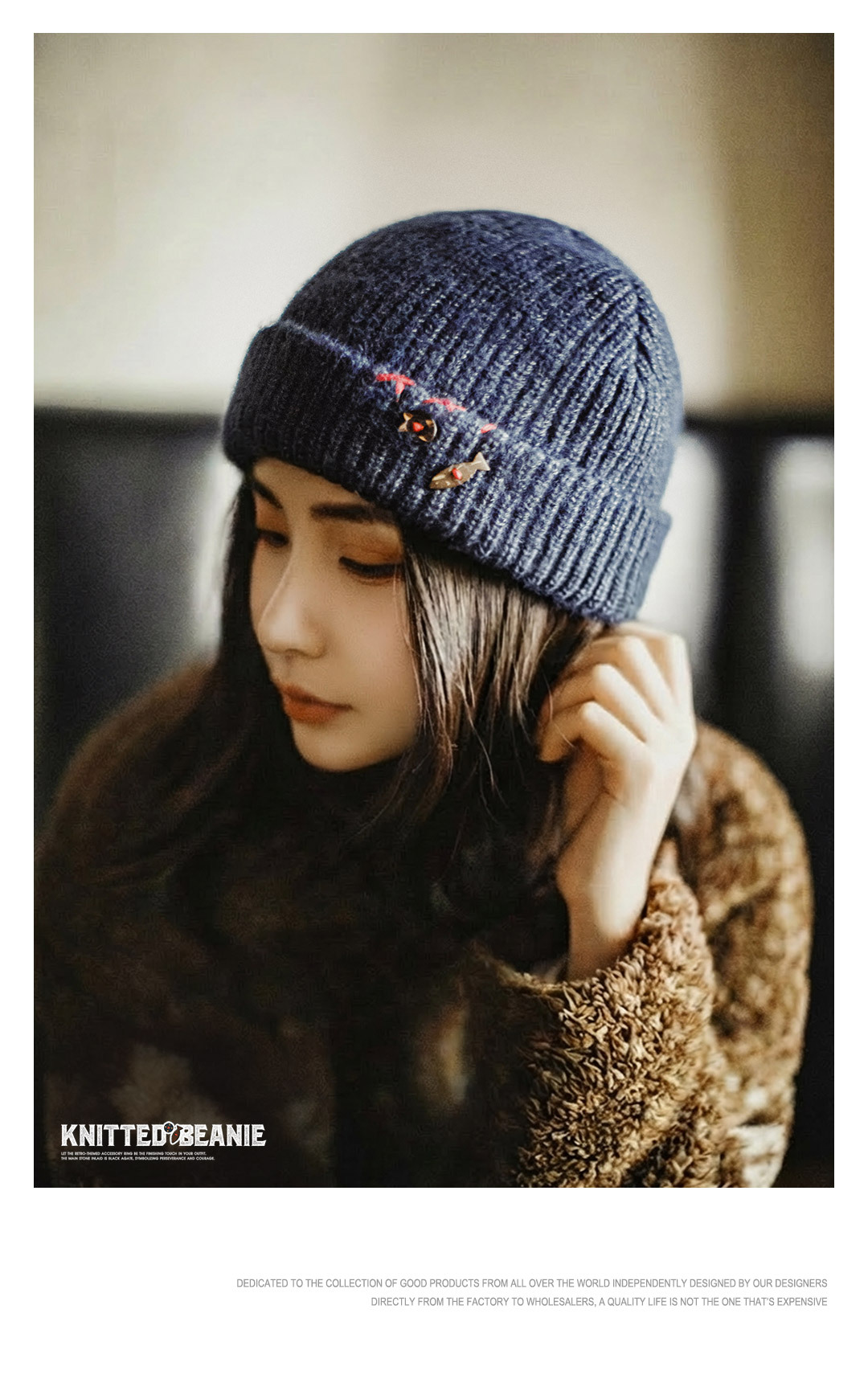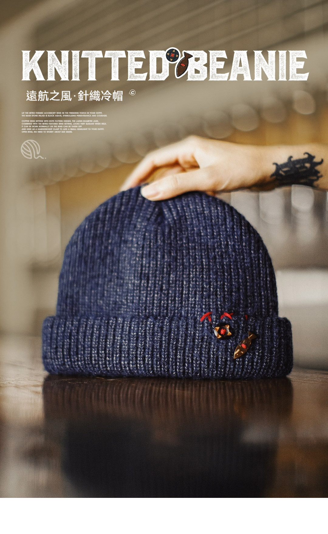 藏青色復古針織保暖加厚毛線冷帽子大頭圍防寒護耳瓜皮帽女冬